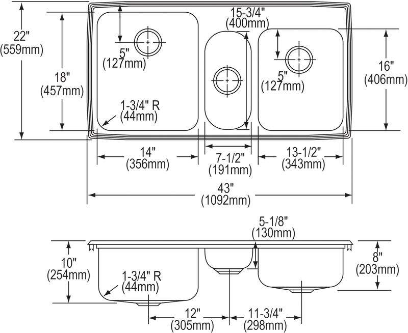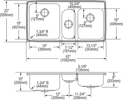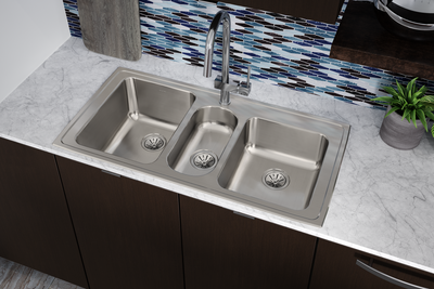 Elkay Lustertone Classic Stainless Steel 43" x 22" x 10", Triple Bowl Drop-in Sink