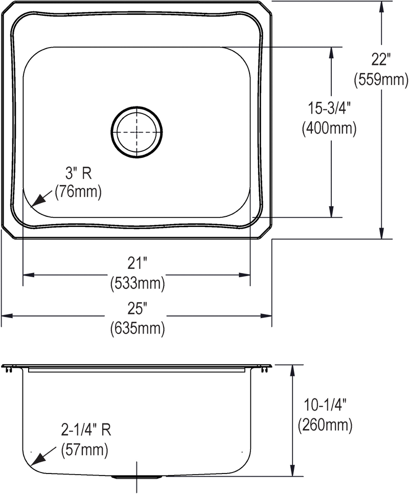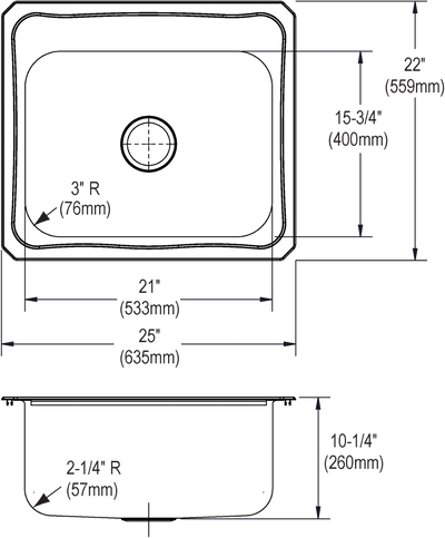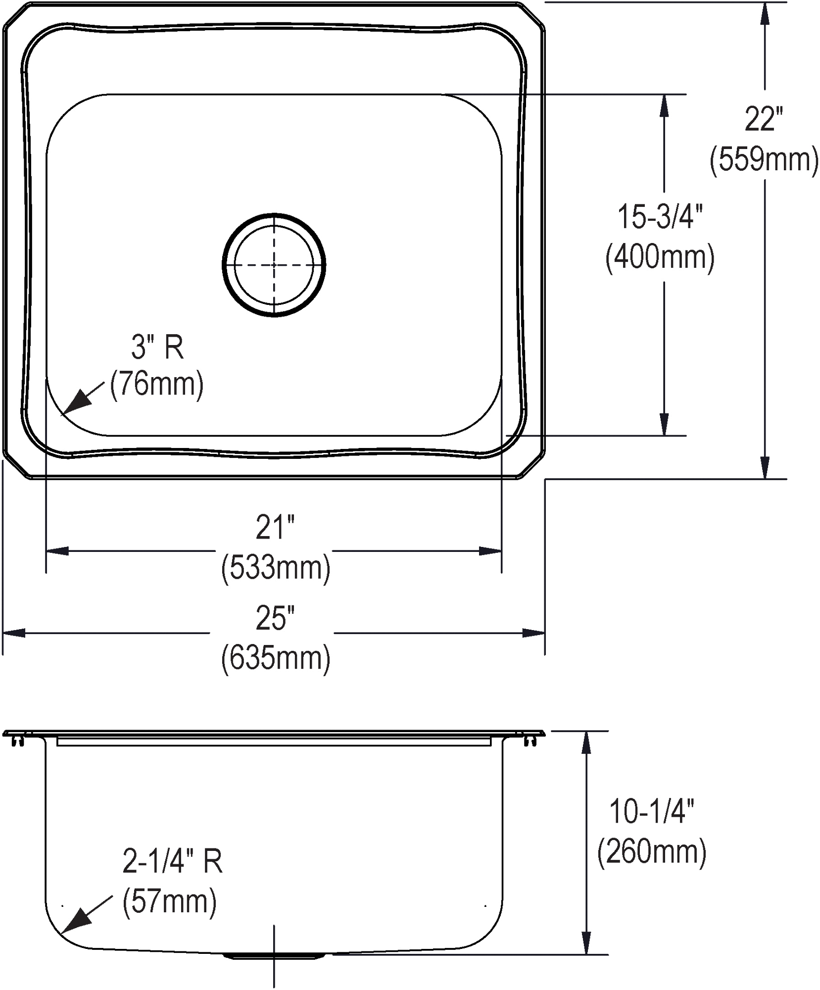- CENTER DRAIN: Drain is conveniently placed in the center of the sink.