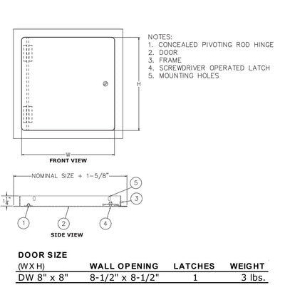 8" x 8" Metal Dry Wall Access Door, Screwdriver Latch, Prime Coat Finish