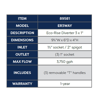 Atlantic's revolutionary Eco-Rise Diverter accepts 1 1/2" or 2" plumbing and provides 3 valved 1" outlets for ultimate flow control. The Eco-Rise Diverter splits a single source into multiple adjustable outlets.