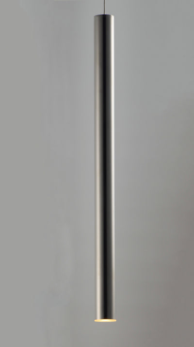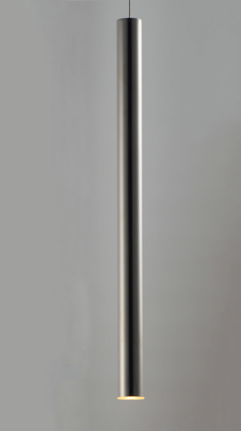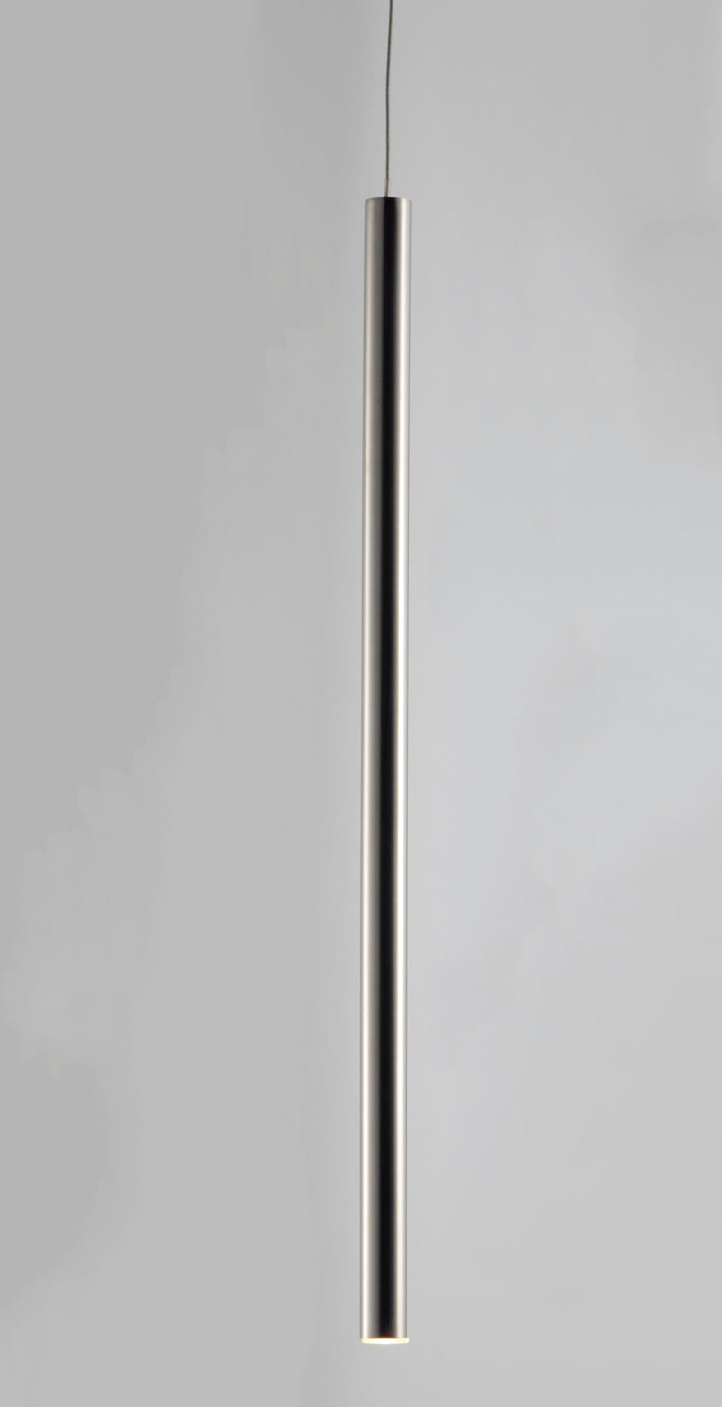 Elongated metal tubes in a variety of finishes from Rose Gold to Polished Chrome suspend from pans to create impressive sculptural statements. Each tube encase a replaceable integrated LED module while many of the ceiling pans house additional LED spots to highlight the beautiful high gloss finishes as well as additional down light.