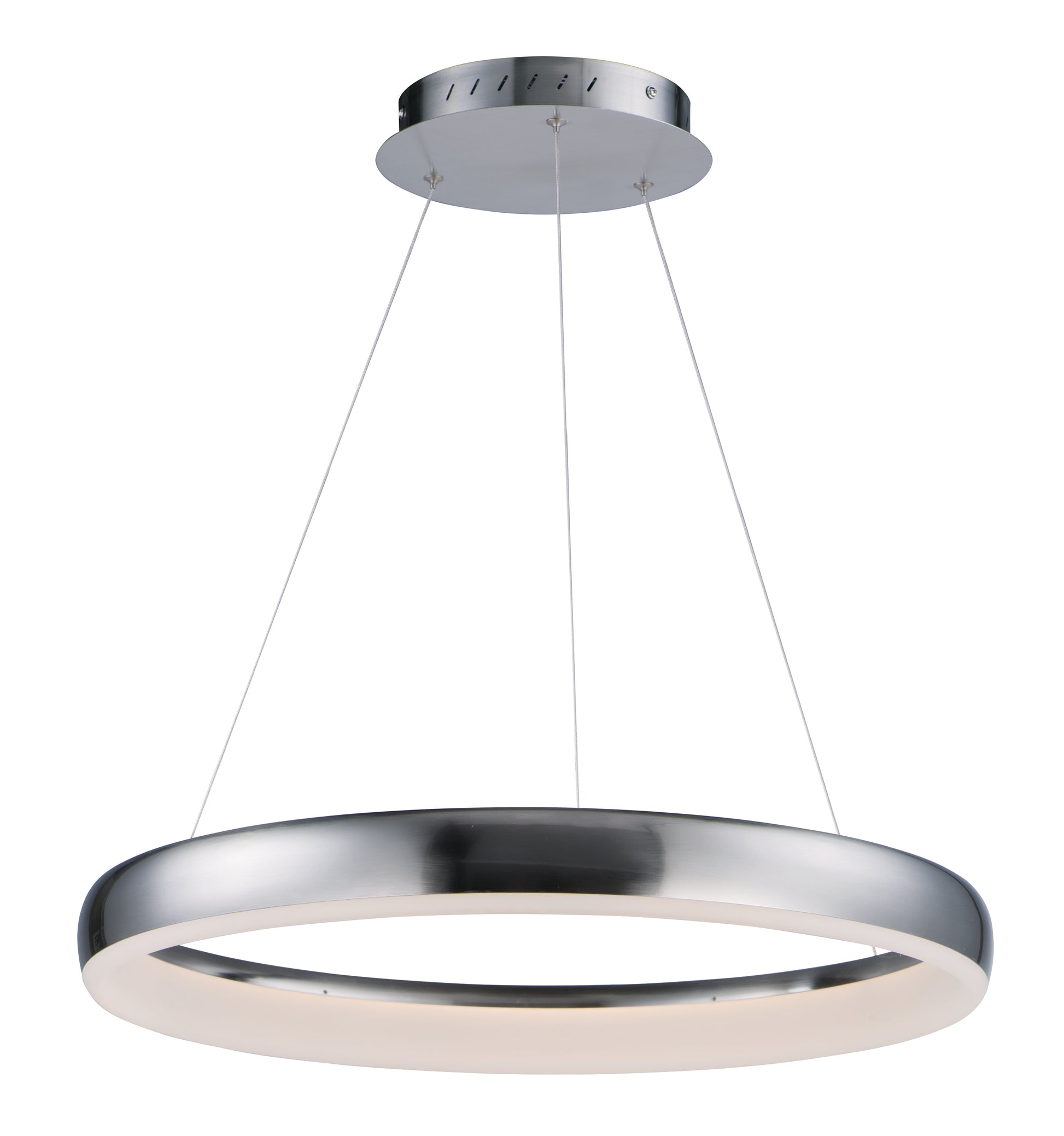 Doughnut shaped rings finished in a beautiful Satin Nickel create a soft contemporary design. LEDs are mounted at an angle to evenly illuminate the entire diffuser a soft diffused light.