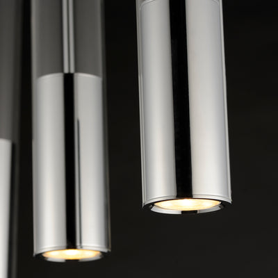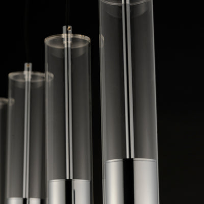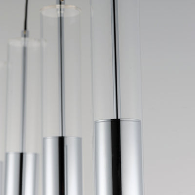Machined Aluminum tubes of Black, Polished Chrome, or Brass suspend within clear glass overlays. An LED GU10 bulb is recessed within the metal tube providing great directional lighting. Available as a single pendant or as a 4-Light linear pendant.