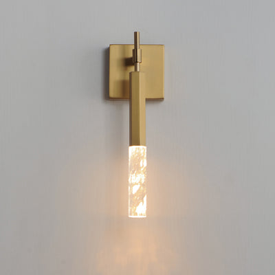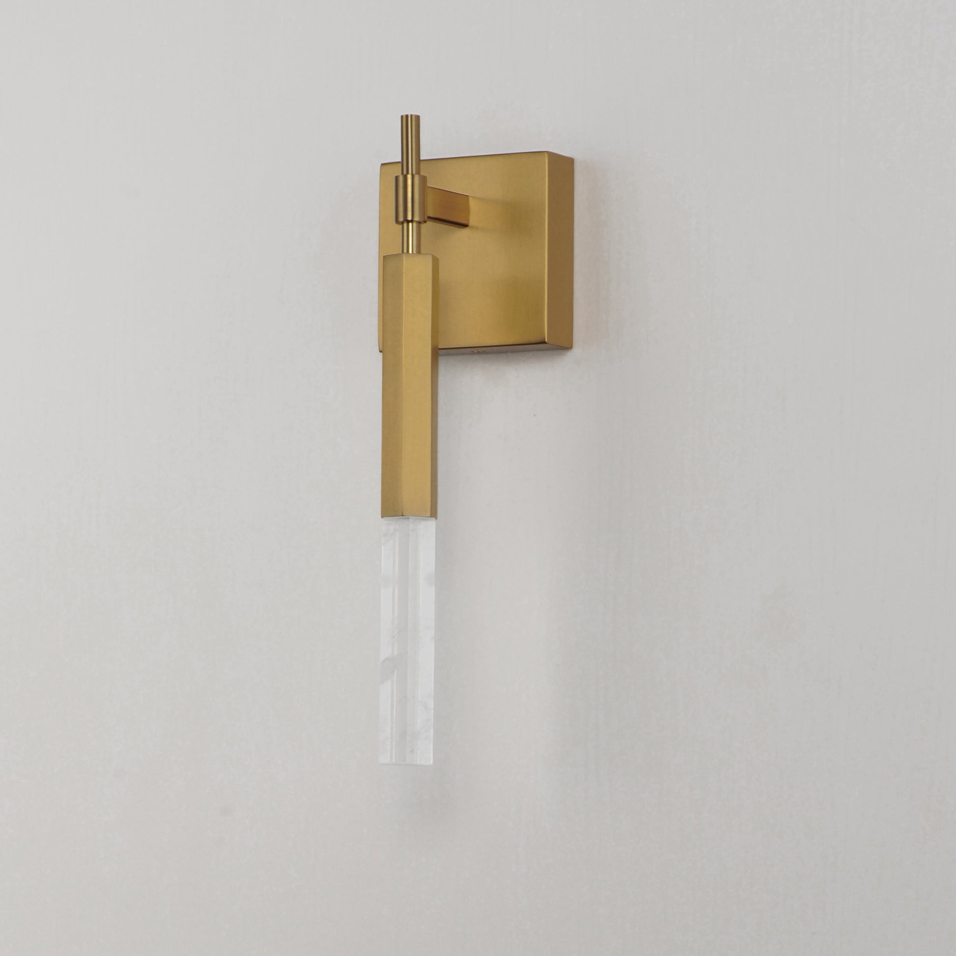 Hexagonal tubes of various lengths support blocks of naturally translucent rock crystal. Each stone varies in diaphaneity making a unique display of refracted light. Available in a plated soft Gold or Matte Black, this luxurious LED pendant light cluster and coordinating wall sconce accentuates the beauty of the natural quartz material.