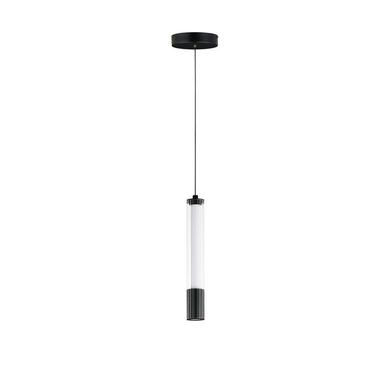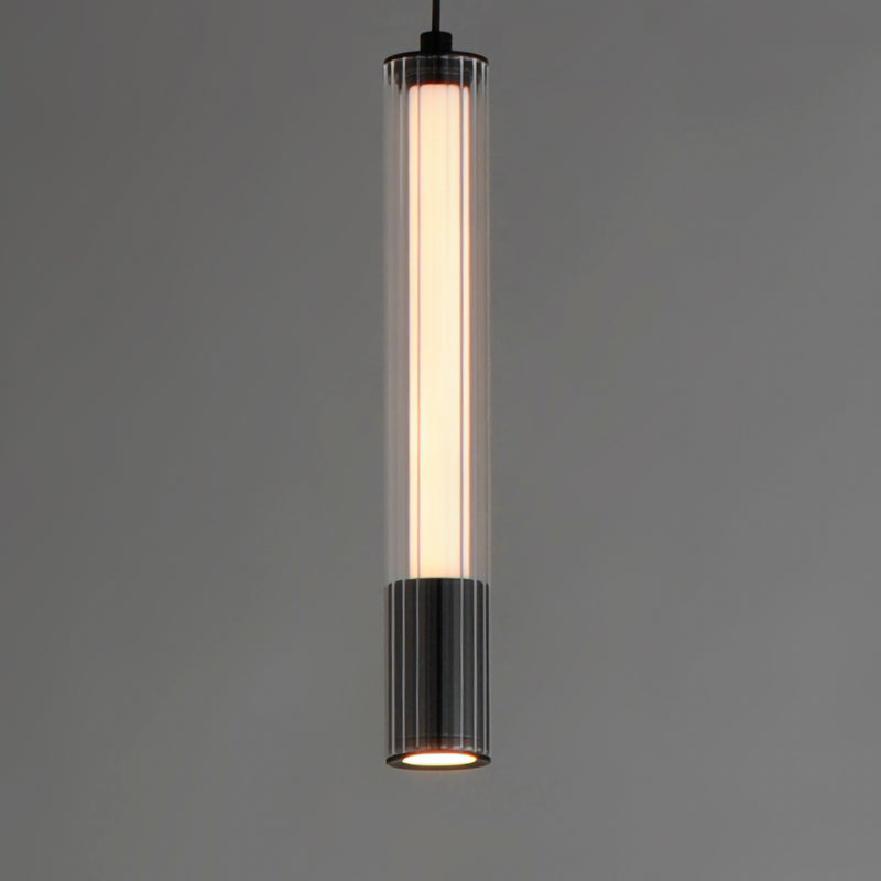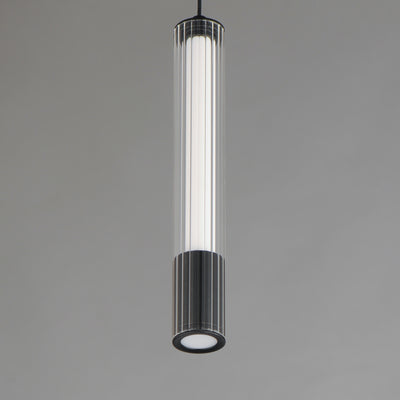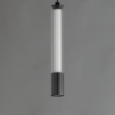 A central, cylinder diffuser of opal white acrylic diffuses LED lighting within a cavity of thin ribbed glass of various lengths. Both imaginative and functional, the bright pendants encase an additional down light recessed within a Polished Chrome, Naturally Aged Brass or Matte Black housing casting light downward.