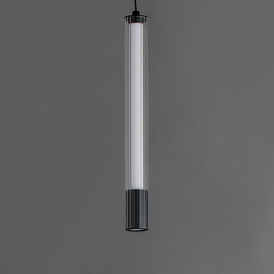 A central, cylinder diffuser of opal white acrylic diffuses LED lighting within a cavity of thin ribbed glass of various lengths. Both imaginative and functional, the bright pendants encase an additional down light recessed within a Polished Chrome, Naturally Aged Brass or Matte Black housing casting light downward.