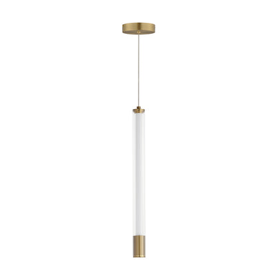 A central, cylinder diffuser of opal white acrylic diffuses LED lighting within a cavity of thin ribbed glass of various lengths. Both imaginative and functional, the bright pendants encase an additional down light recessed within a Polished Chrome, Naturally Aged Brass or Matte Black housing casting light downward.