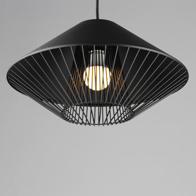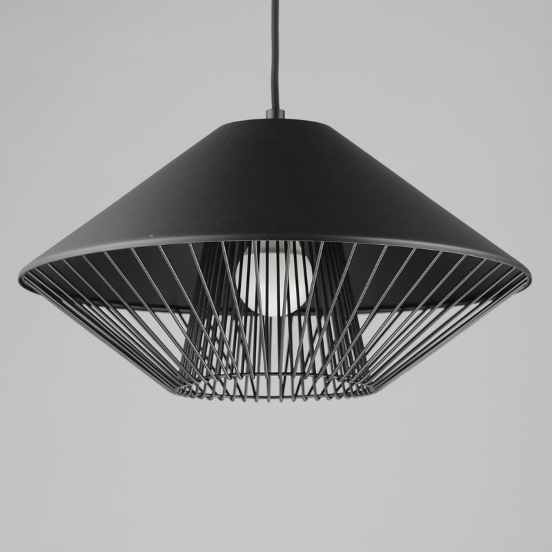 Both modern and industrial, the angular lines of these aluminum spun shades refresh a classic concept in a clean, contemporary execution. The shades - available in Brick, Black, and a Pale Gray powder coated finish, feature multiple joints and peaks in their form and at their bottom intentionally return inward. The shape at the bottom is not only attractive, but a cleverly conceived method to support a wire network of Black steel that forms a cage without visible hardware. Illuminated from within the spun metal shades in 3 varying sizes and shapes, the LED lamp provided shines light below and disperses through the wireway creating a beautiful radiating light pattern.