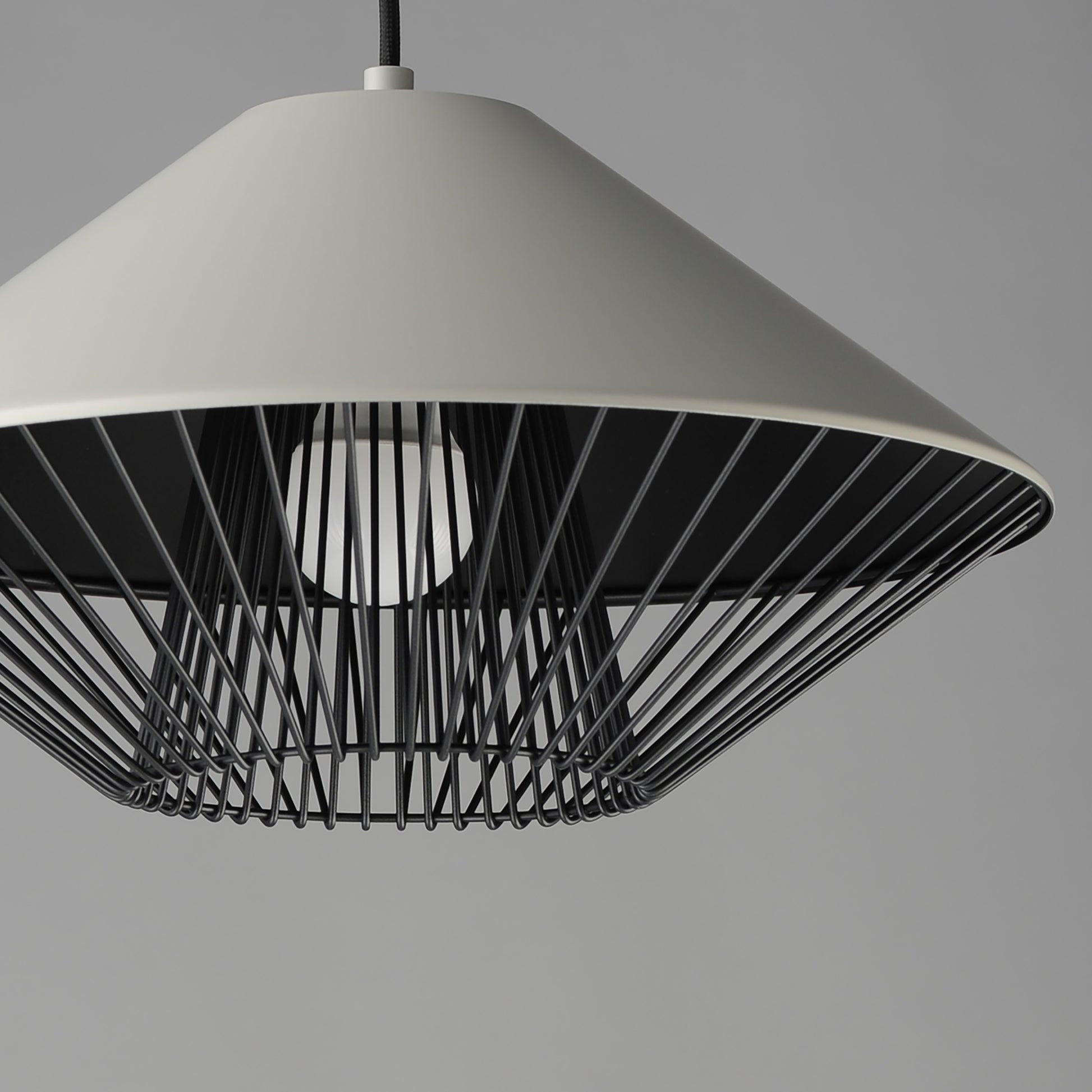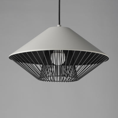 Both modern and industrial, the angular lines of these aluminum spun shades refresh a classic concept in a clean, contemporary execution. The shades - available in Brick, Black, and a Pale Gray powder coated finish, feature multiple joints and peaks in their form and at their bottom intentionally return inward. The shape at the bottom is not only attractive, but a cleverly conceived method to support a wire network of Black steel that forms a cage without visible hardware. Illuminated from within the spun metal shades in 3 varying sizes and shapes, the LED lamp provided shines light below and disperses through the wireway creating a beautiful radiating light pattern.
