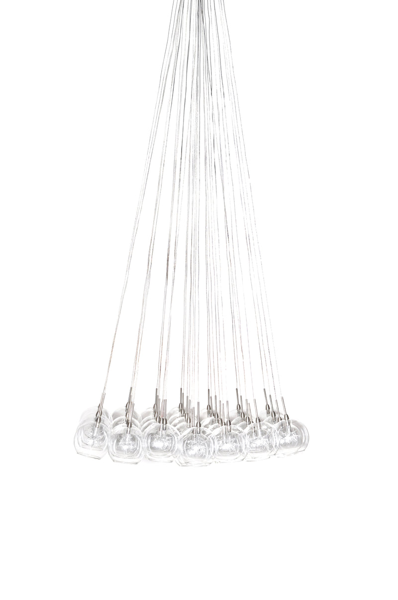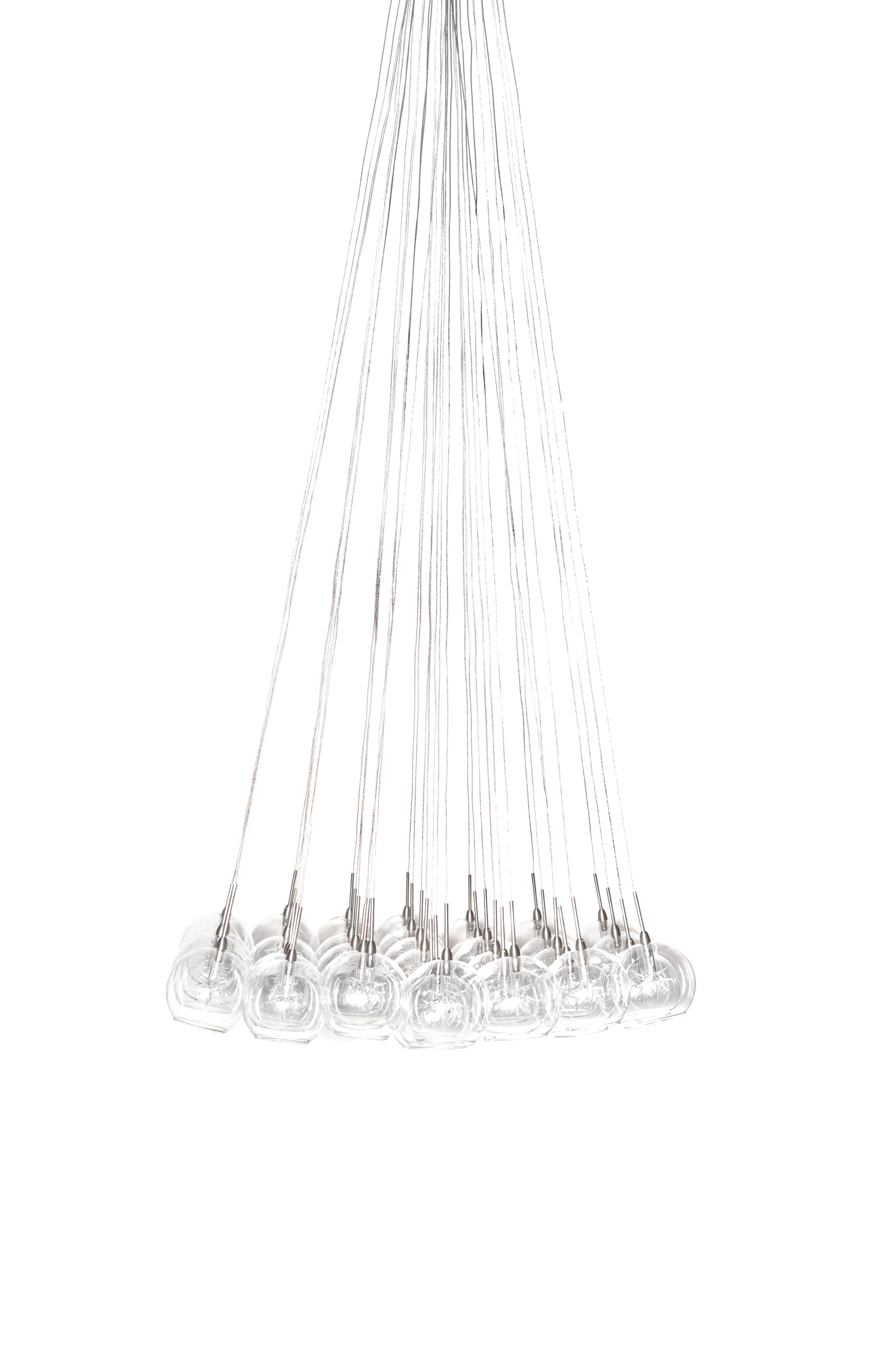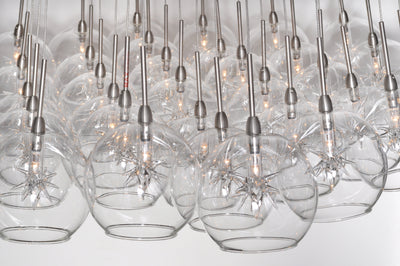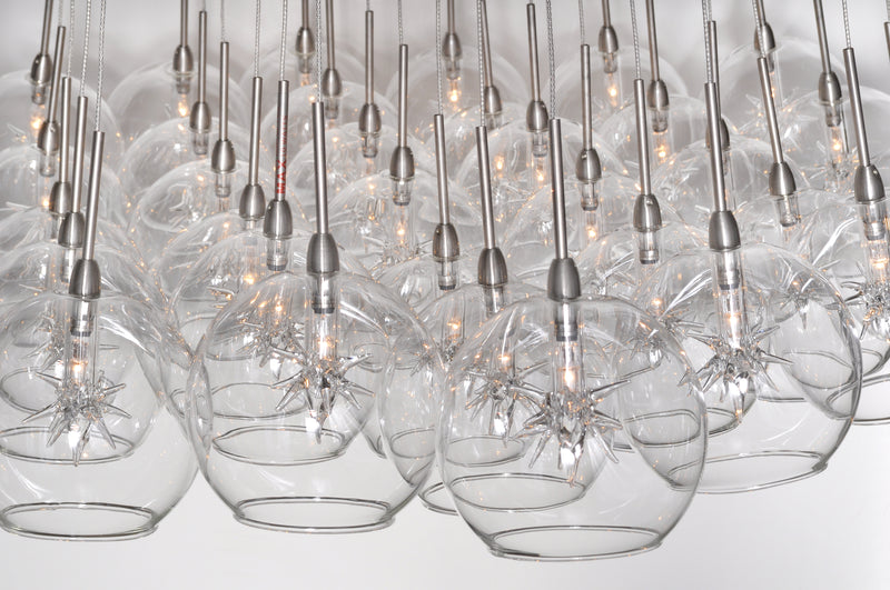 Nathaniel Parker Willis once wrote "There they stand, the innumerable stars, shining in order like a living hymn, written in light". The Starburst collection evokes a story with the amazing multi-light pendants available in clear, blue, green, amber or violet. Each burst of color is suspended within its own glass globe, adding to the unique tale of the design. Chrome hardware and a satin nickel finish canopy completes each structure, adding an essential touch to enhance any designers' space.