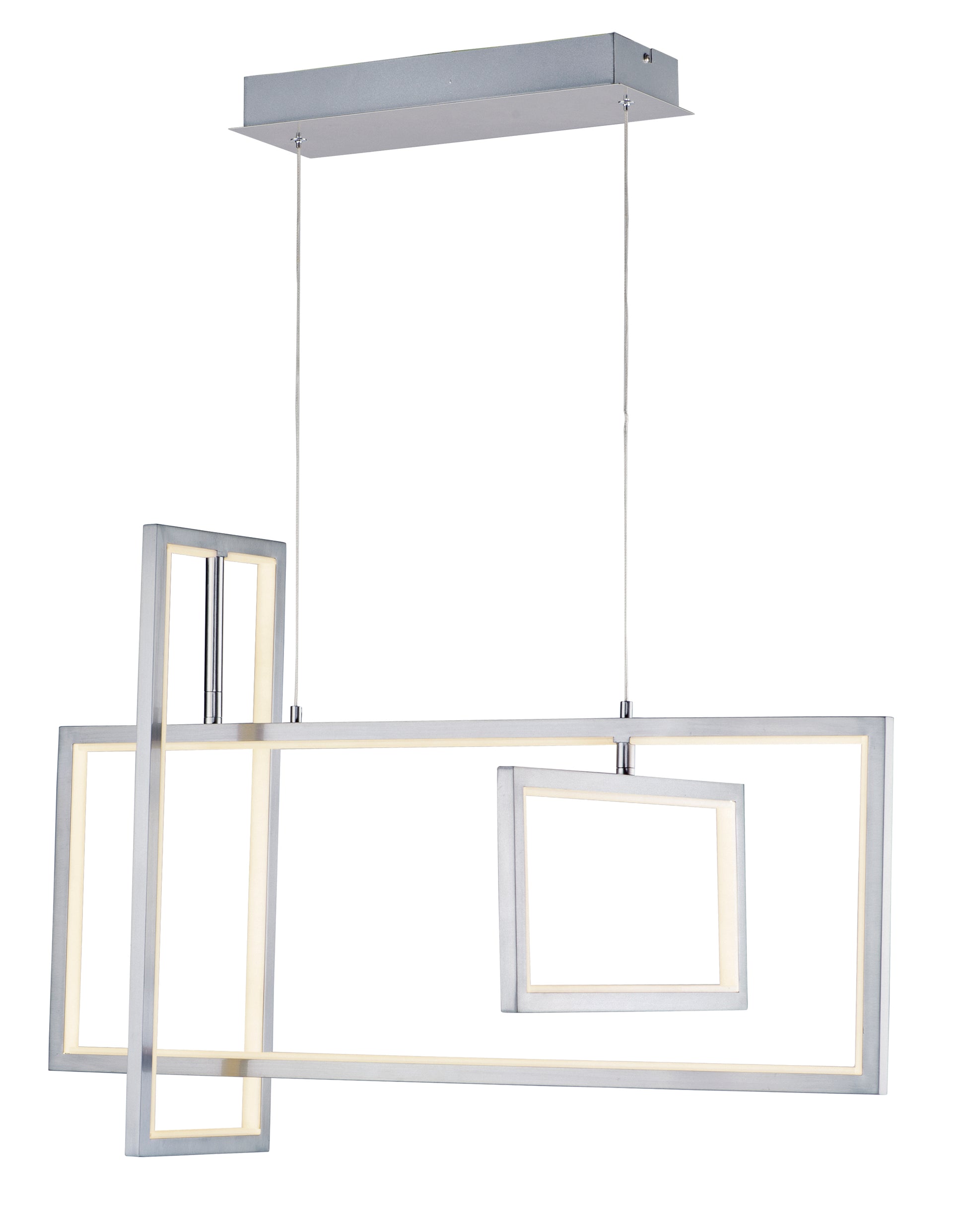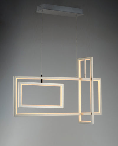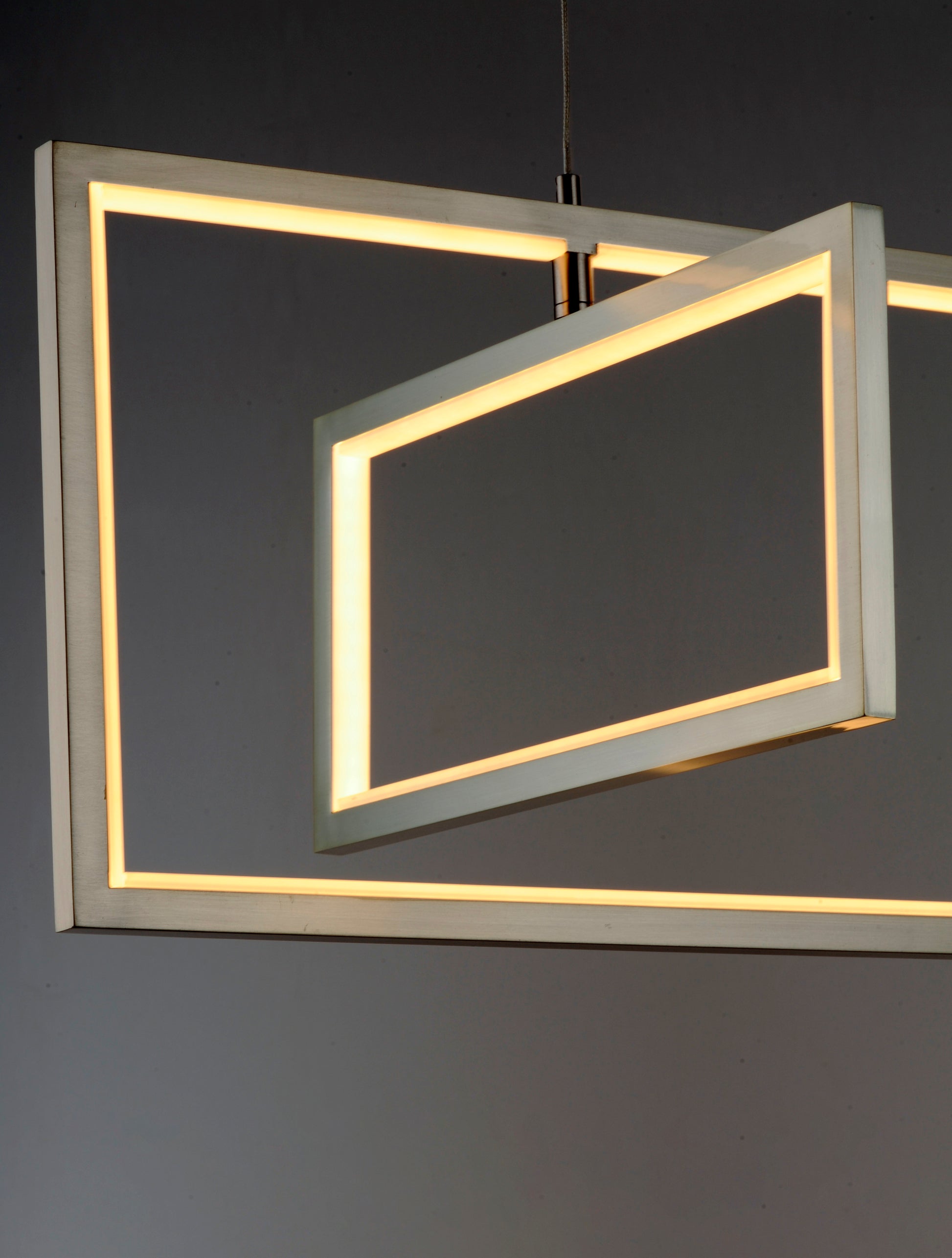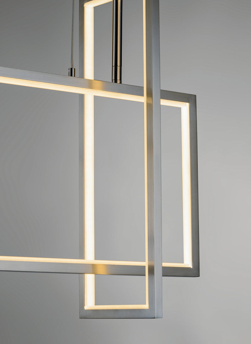 Chain links of Satin Nickel are illuminated internally by encased LED light. The suspending frames are adjustable to create different expansions of the linear pendants and flush mounts. A coordinating wall sconce completes this streamlined contemporary collection.