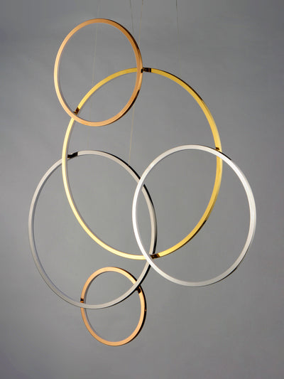 Intersecting rings for this large scale sculpture available in either vertical or horizontal configurations. Multiple high end finishes were used to blend in with today's eclectic interiors. The perfect fixture to fill a large space, this can also be installed against the wall as artwork.