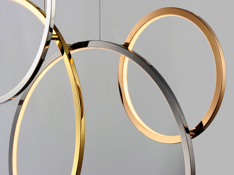 Intersecting rings for this large scale sculpture available in either vertical or horizontal configurations. Multiple high end finishes were used to blend in with today's eclectic interiors. The perfect fixture to fill a large space, this can also be installed against the wall as artwork.