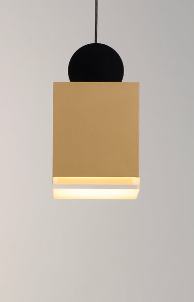 These geometric pendants can be arranged at various heights to create both a sculptural and functional form. Housings of plated Gold in various shapes and sizes are topped with a round handle of Black and finished on the bottom with a Clear acrylic diffuser.