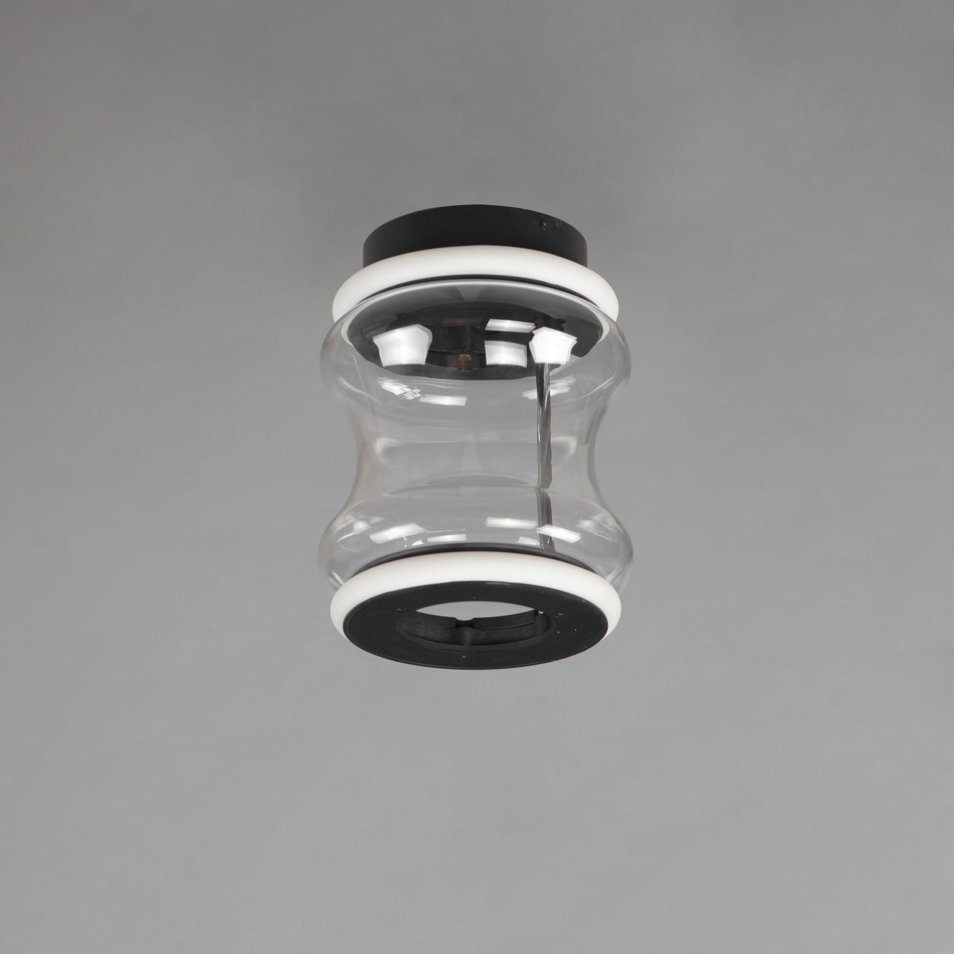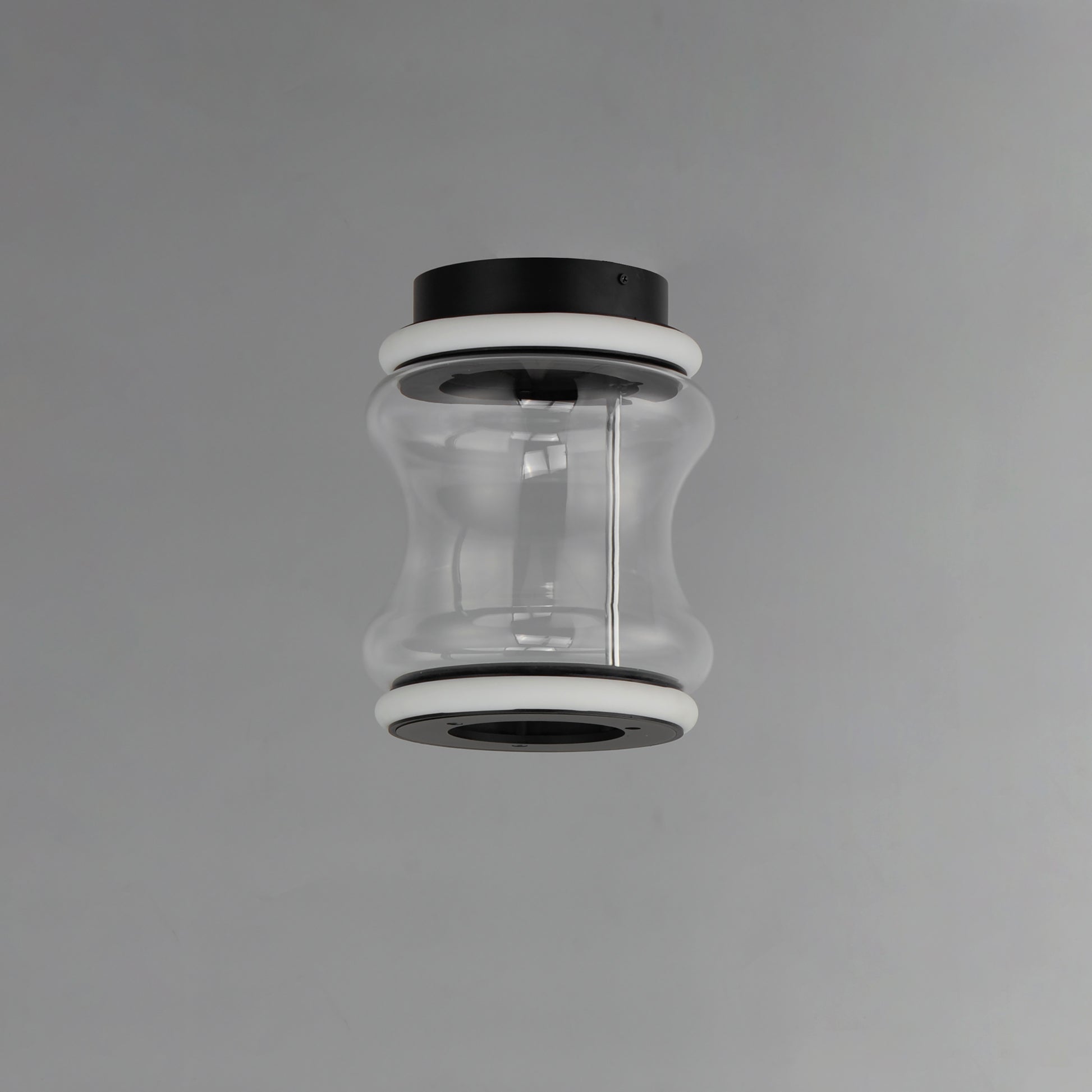 Segmented by bright LED rings finished in Matte Black, glass shades of an hourglass shape are combined into various configurations. The hand-blown glass is entirely transparent and varies in size creating an undulating pattern. All together, the series includes pendants, flush mounts, and portable lamps.