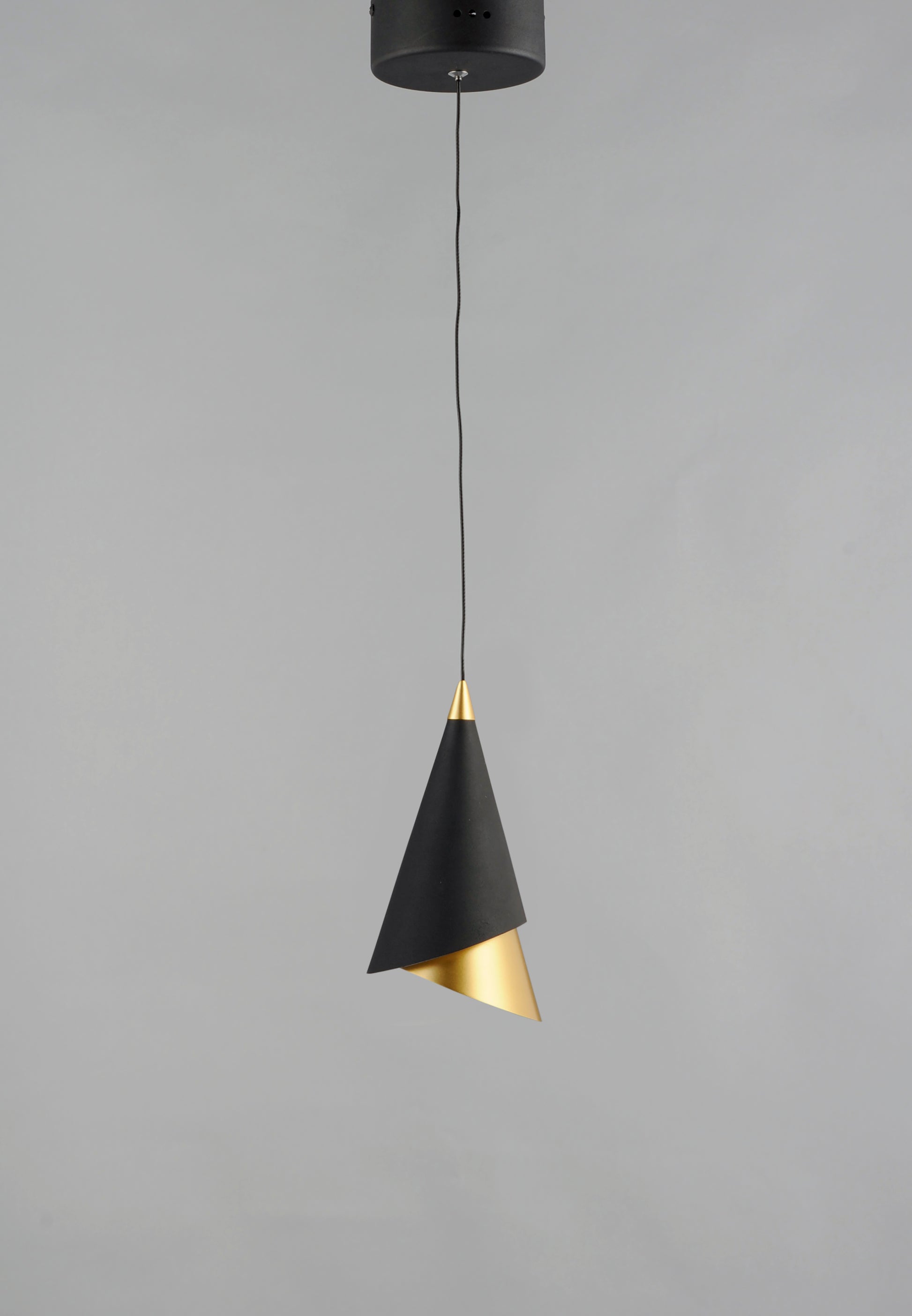 This unique collection features pendants constructed of two separate pieces inserted into each other. The Matte Black outer shade is bevel cut in an opposing direction of the inner Metallic Gold shade. The inner shade can rotate to give a different look and a frosted glass pane softly diffuses the recessed LED source.