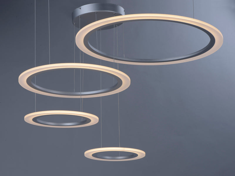 A new variation of a very popular series with many different configurations many of which are large scale for commercial applications. Metal rings of Matte Silver support horizontal acrylic diffusers which glow when illuminated by dimmable LED.