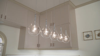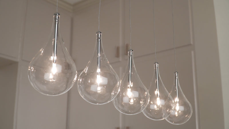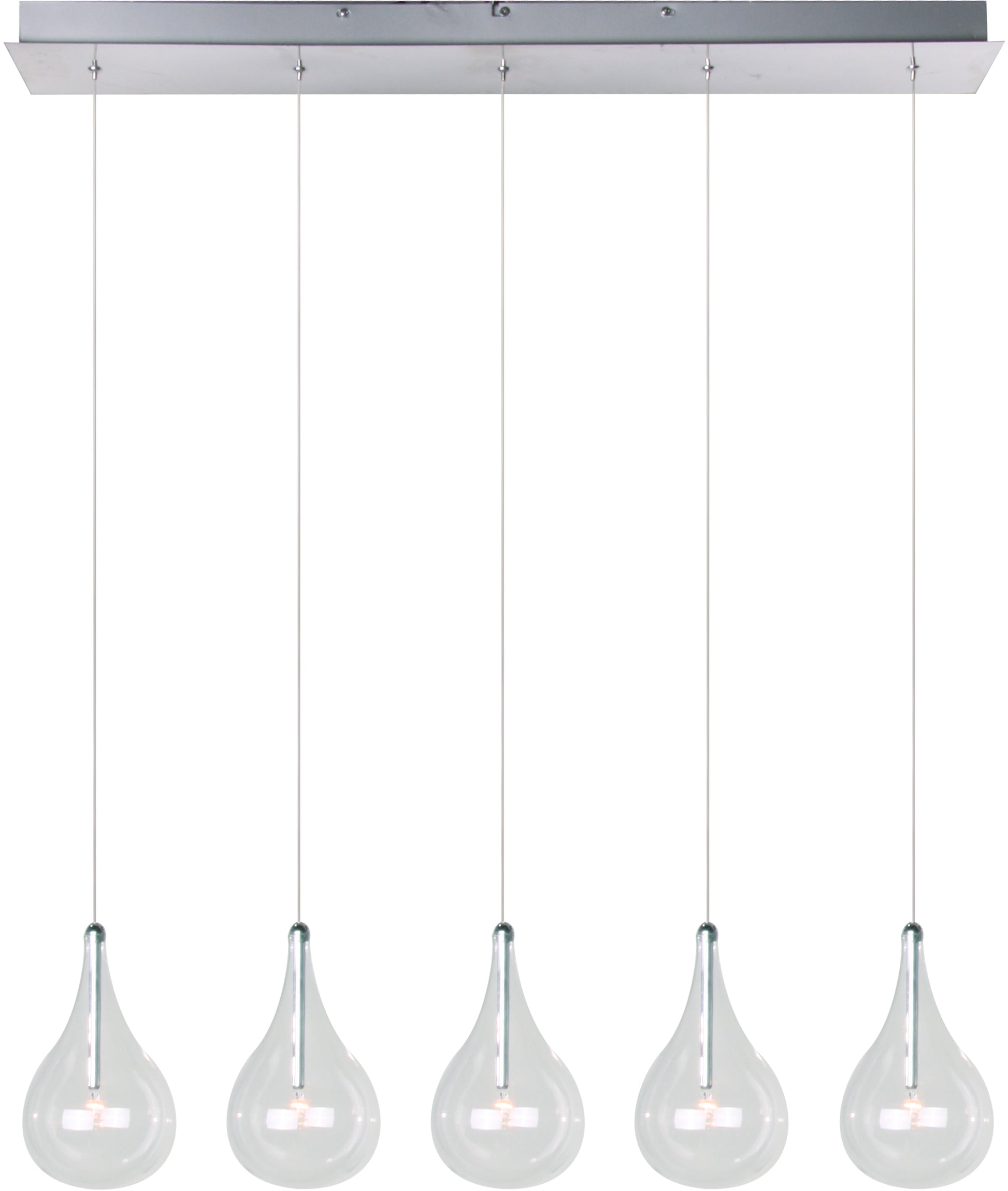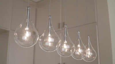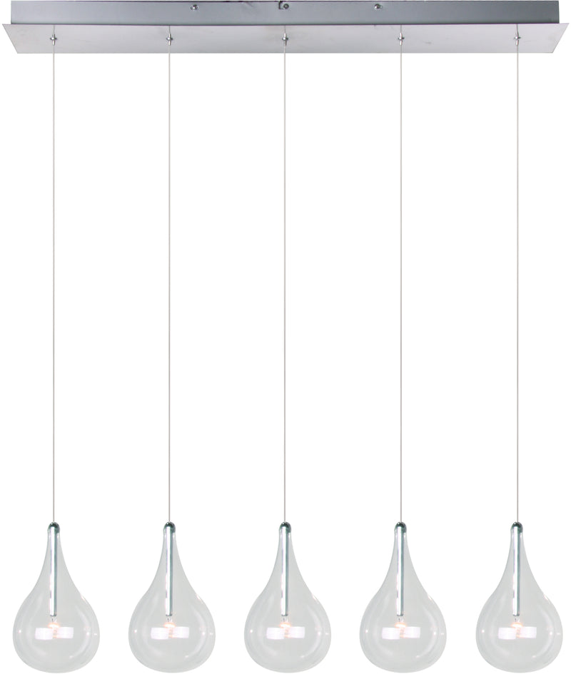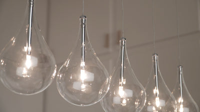 A simple idea gracefully executed in the Larmes collection. Row upon row of Clear oversized teardrops, mounted onto an extended Polished Chrome lamp holder that supports xenon lamps, sets the stage. Individually adjustable drops for custom stagger effects allow for dramatic impact. An added benefit of each drop being aircraft cable-suspended, is the ability to adjust the overall height of the piece to fit the space. The final result is stark and stunning.