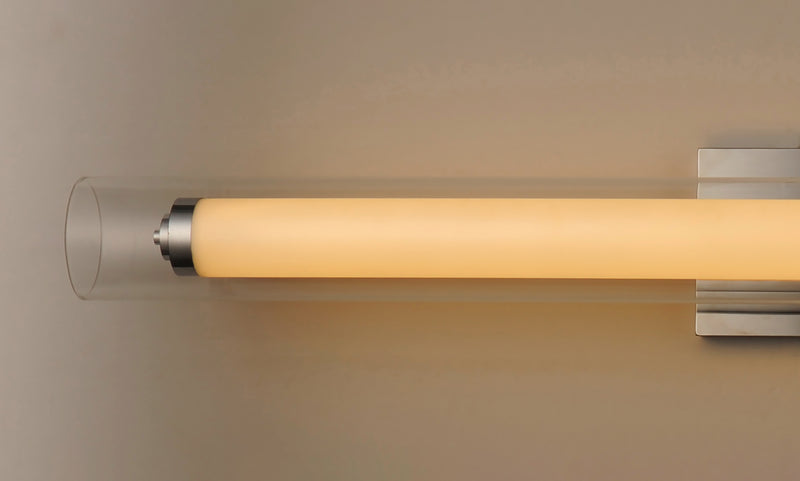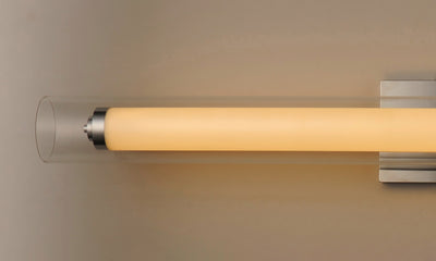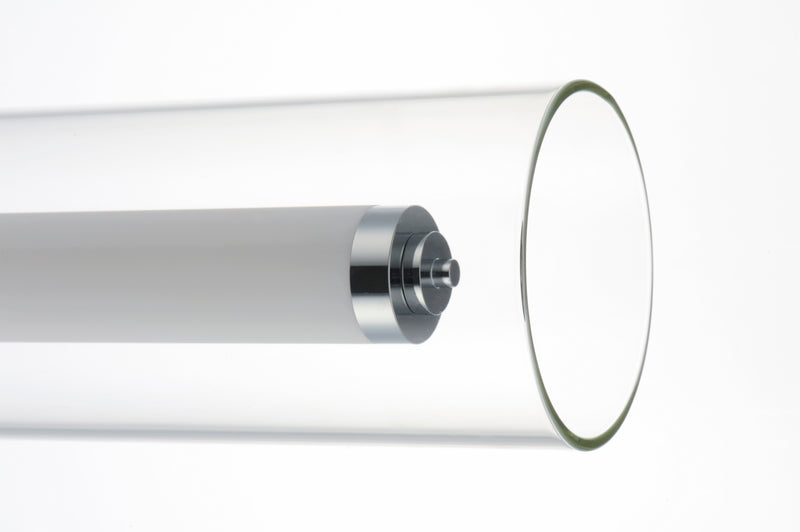 Clear glass outer tube encases a white acrylic inner tube capped with polished Chrome caps creates this clean contemporary design. Powered by high output LED which is nicely diffused make this collection suitable for both residential and commercial applications.