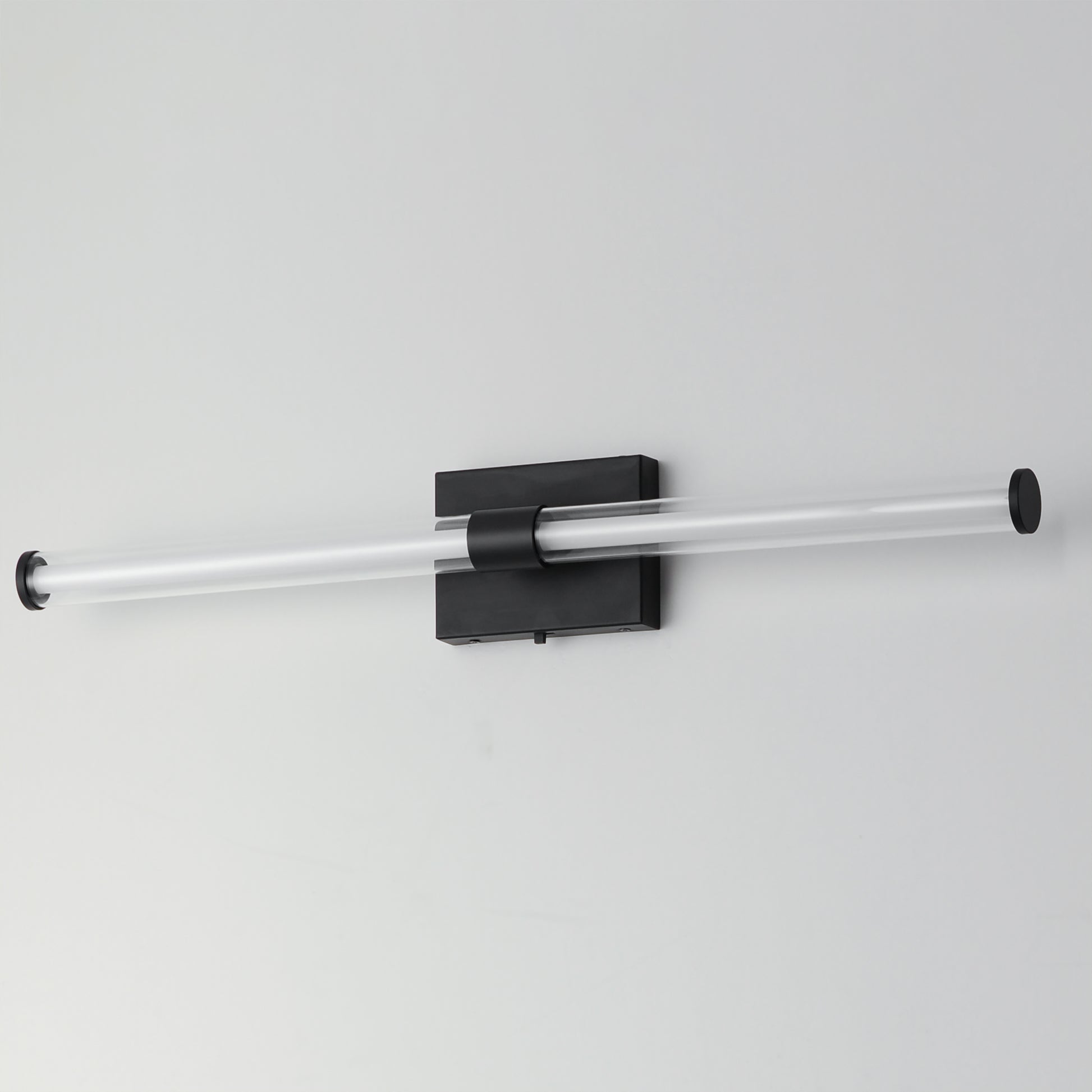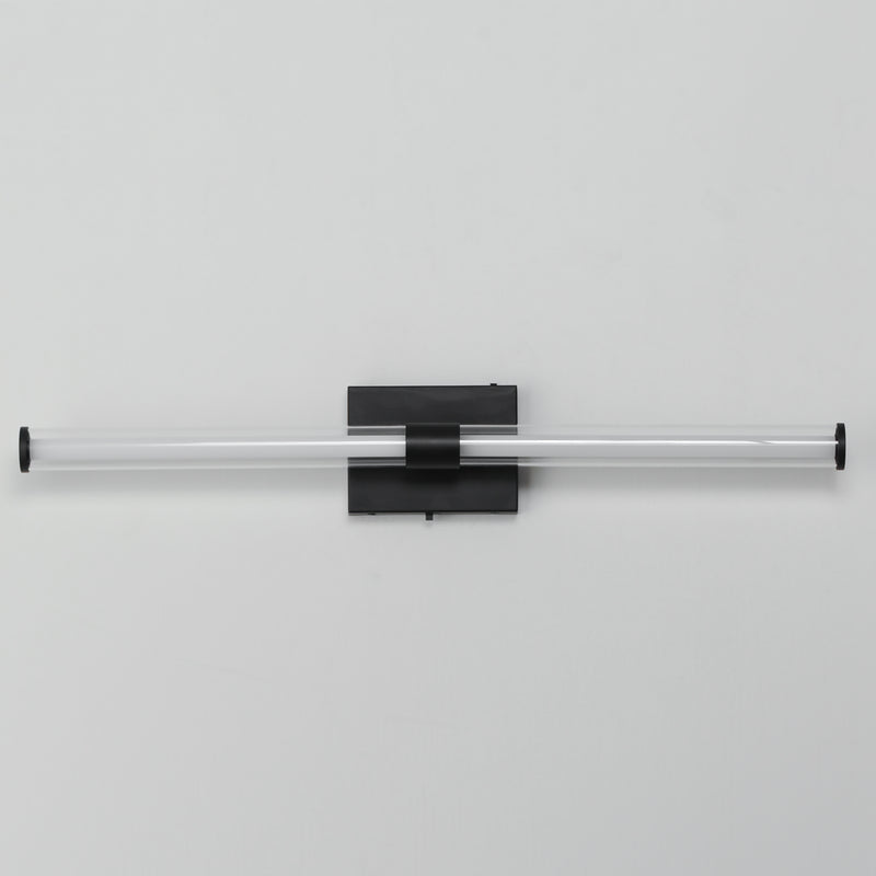 Within the void of clear glass, a white cylindrical tube of LED light extends in two directions. The evenly distributed light source can be adjusted to 5 selectable color temperatures, from warm 2700k to a cool 5000K and neutral white light sources in between. Available in three finish options: matte Black, Natural Aged Brass, and Polished Chrome, these sconces are great for use in bathrooms and along corridors with extensions less than 4 inches for ADA compliance.