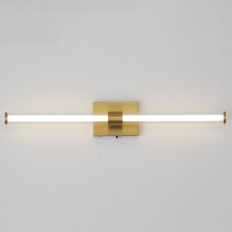 Within the void of clear glass, a white cylindrical tube of LED light extends in two directions. The evenly distributed light source can be adjusted to 5 selectable color temperatures, from warm 2700k to a cool 5000K and neutral white light sources in between. Available in three finish options: matte Black, Natural Aged Brass, and Polished Chrome, these sconces are great for use in bathrooms and along corridors with extensions less than 4 inches for ADA compliance.