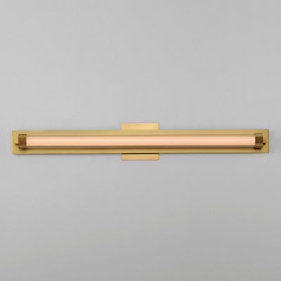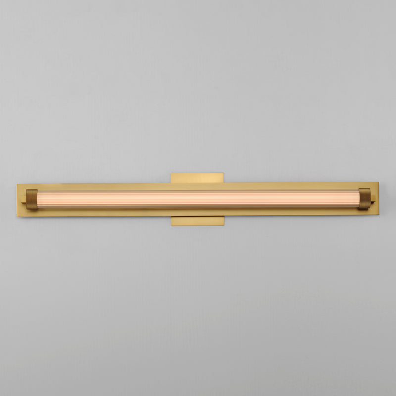 Clear ribbed glass encases a tube of opal white acrylic evenly illuminated by LED. The ends of the glass shade are fitted with knurled cylinder forms that suspend the sconces from their mounting plates. Dual mounted options are available for this series allowing it to be installed on single gang junction boxes. Available in Natural Aged Brass, Polished Chrome, or Matte Black finishes.
