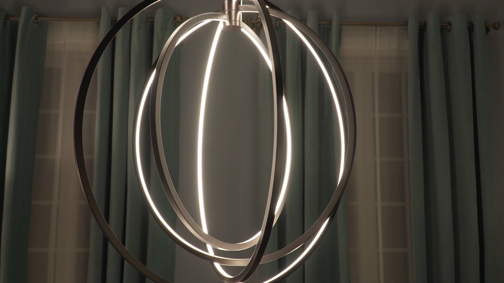 Four concentric rings strategically placed in orbit to form a spherical lighting design as unique as it is functional. With the internal placement of LED strips within either a Bronze or Brushed Pewter frame, the light moves both direct and indirect depending on its orientation.