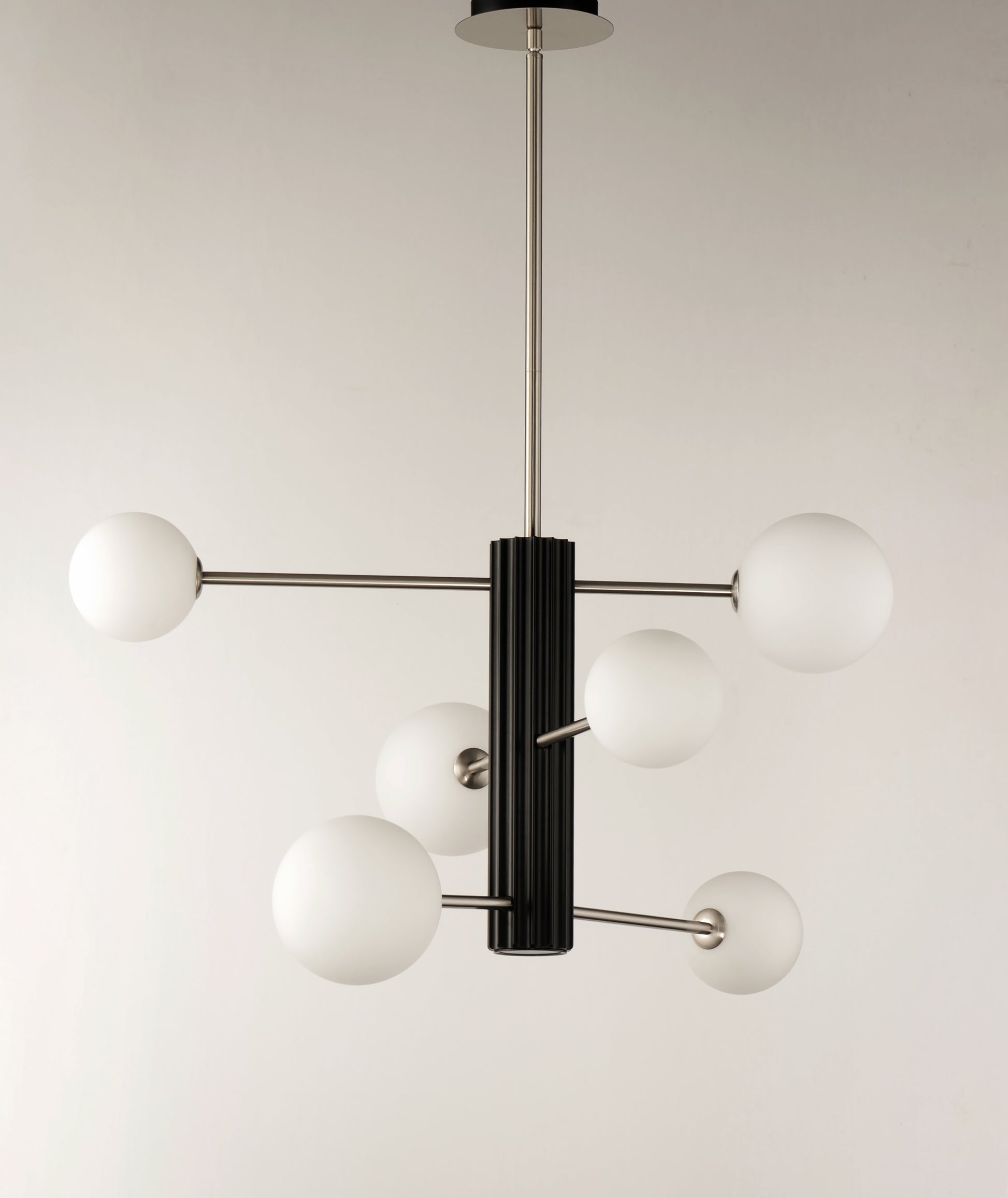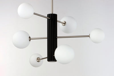 A scalloped aluminum extrusion is finished in Black with intersecting arms of Satin Nickel which support Satin White glass globes illuminated by LED G9 lamps that are included.
