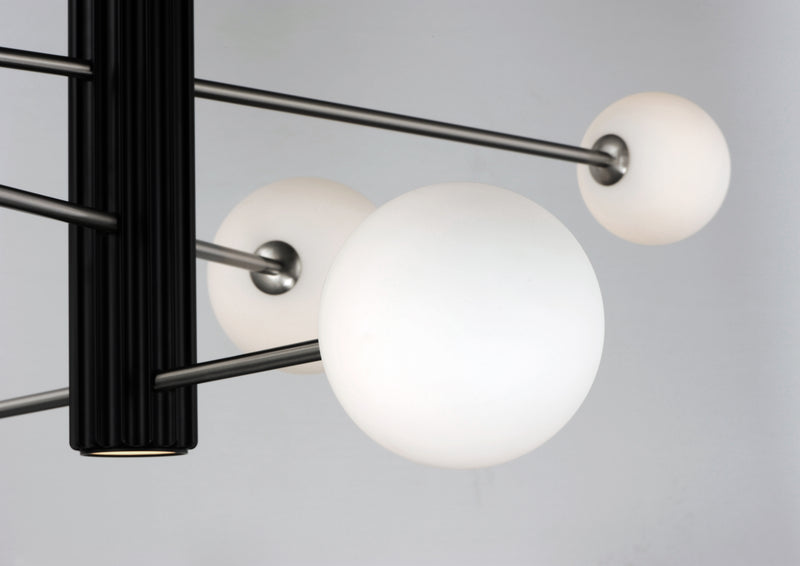 A scalloped aluminum extrusion is finished in Black with intersecting arms of Satin Nickel which support Satin White glass globes illuminated by LED G9 lamps that are included.