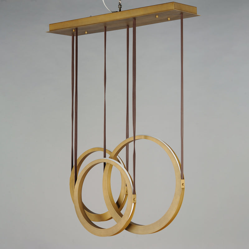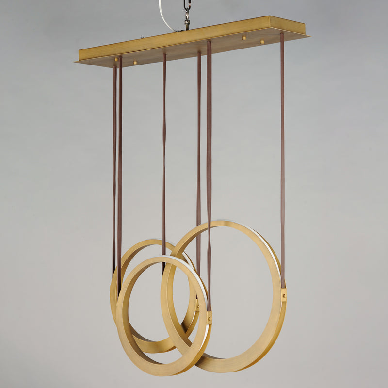 Tapered Antique Brass rings suspend from leather straps in this playful design. Within these rings, concealed LED light sources provide indirect light. This light casts light on neighboring rings while simultaneously illuminating the area above and below the fixture. Suitable for both modern and transitional settings.