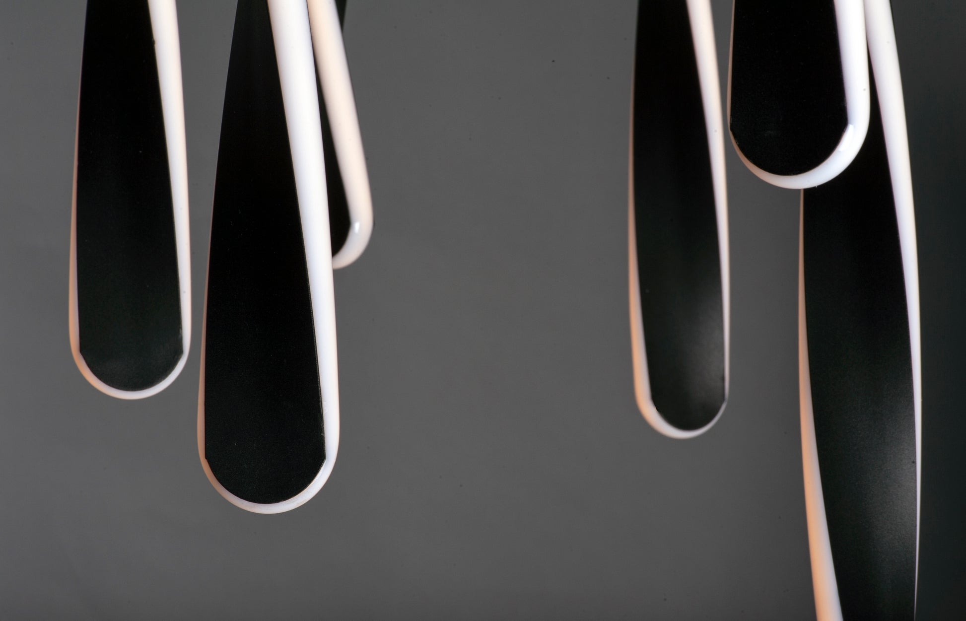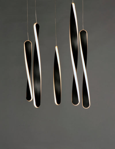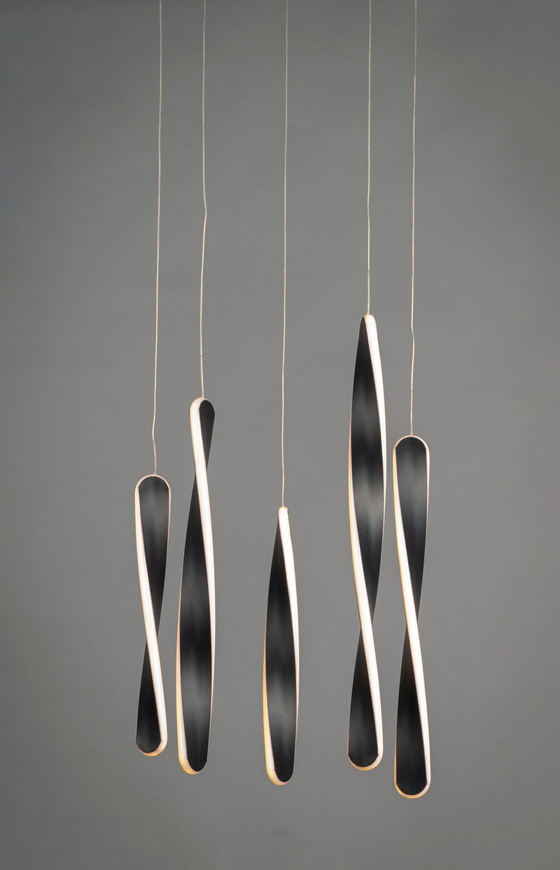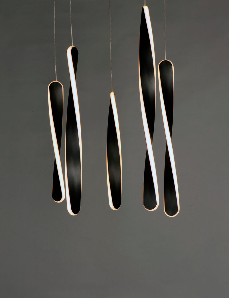 Twisted Black pendants are illuminated on the edge to create a spiral effect. Adjustable heights make it possible to create your own unique design.