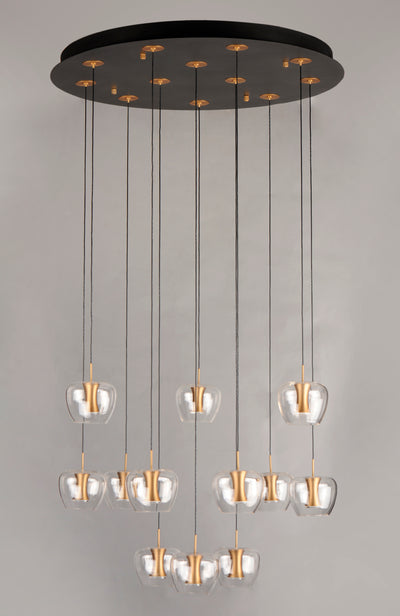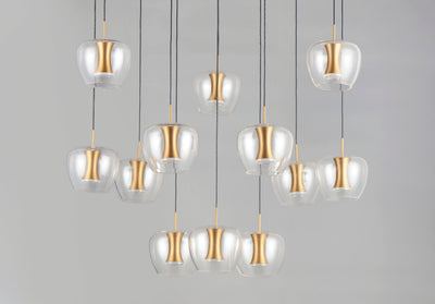 Clear apple shaped glass rest on machined aluminum fonts finished in Satin Brass with integrated LED for even Illumination without the glare. The large scale 25 light comes pre-arranged for ease of installation and is perfect for that tall ceiling application.