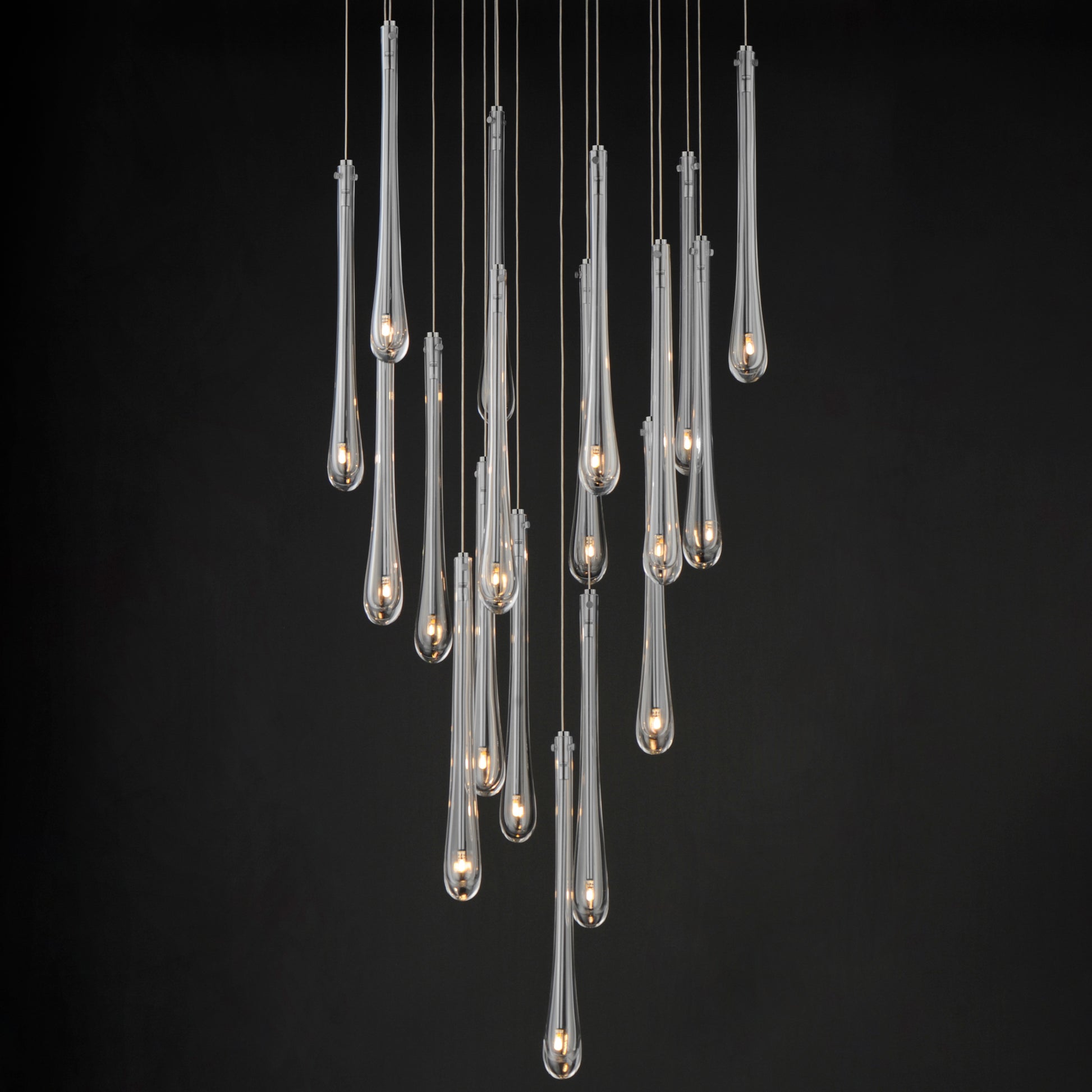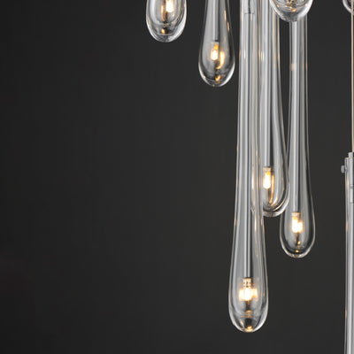 The classic teardrop glass shade is elevated in a luxurious collection of pendant configurations using substantially dense glass that are hand blown in elongated forms and curated into various color combinations. Suspended within the long, slender glass is a similarly long and slender socket to illuminate an energy efficient LED G4 lamp at the base of the glass. The slender tube running within the glass also supports the glass with elegantly flat thumb screws in coordinating finishes. Choose from Matte Black metal with Mirror Smoked glass for a moodier ambience, crystal Clear glass that accentuates the thickness of the glass walls paired with transitional Satin Nickel metalwork, or celebrate the design with effervescent Bubble glass and plated Gold metalwork.