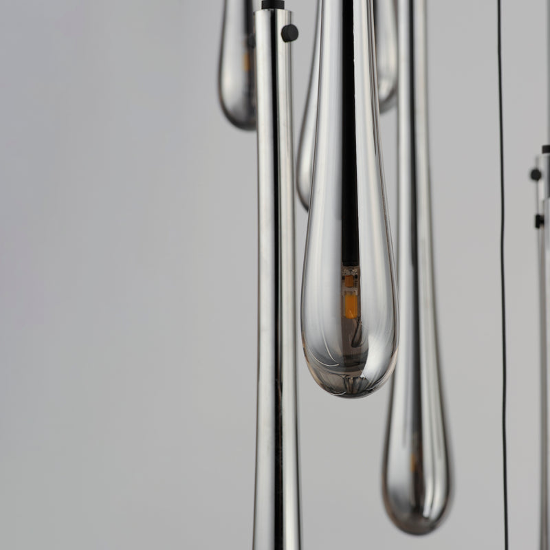 The classic teardrop glass shade is elevated in a luxurious collection of pendant configurations using substantially dense glass that are hand blown in elongated forms and curated into various color combinations. Suspended within the long, slender glass is a similarly long and slender socket to illuminate an energy efficient LED G4 lamp at the base of the glass. The slender tube running within the glass also supports the glass with elegantly flat thumb screws in coordinating finishes. Choose from Matte Black metal with Mirror Smoked glass for a moodier ambience, crystal Clear glass that accentuates the thickness of the glass walls paired with transitional Satin Nickel metalwork, or celebrate the design with effervescent Bubble glass and plated Gold metalwork.