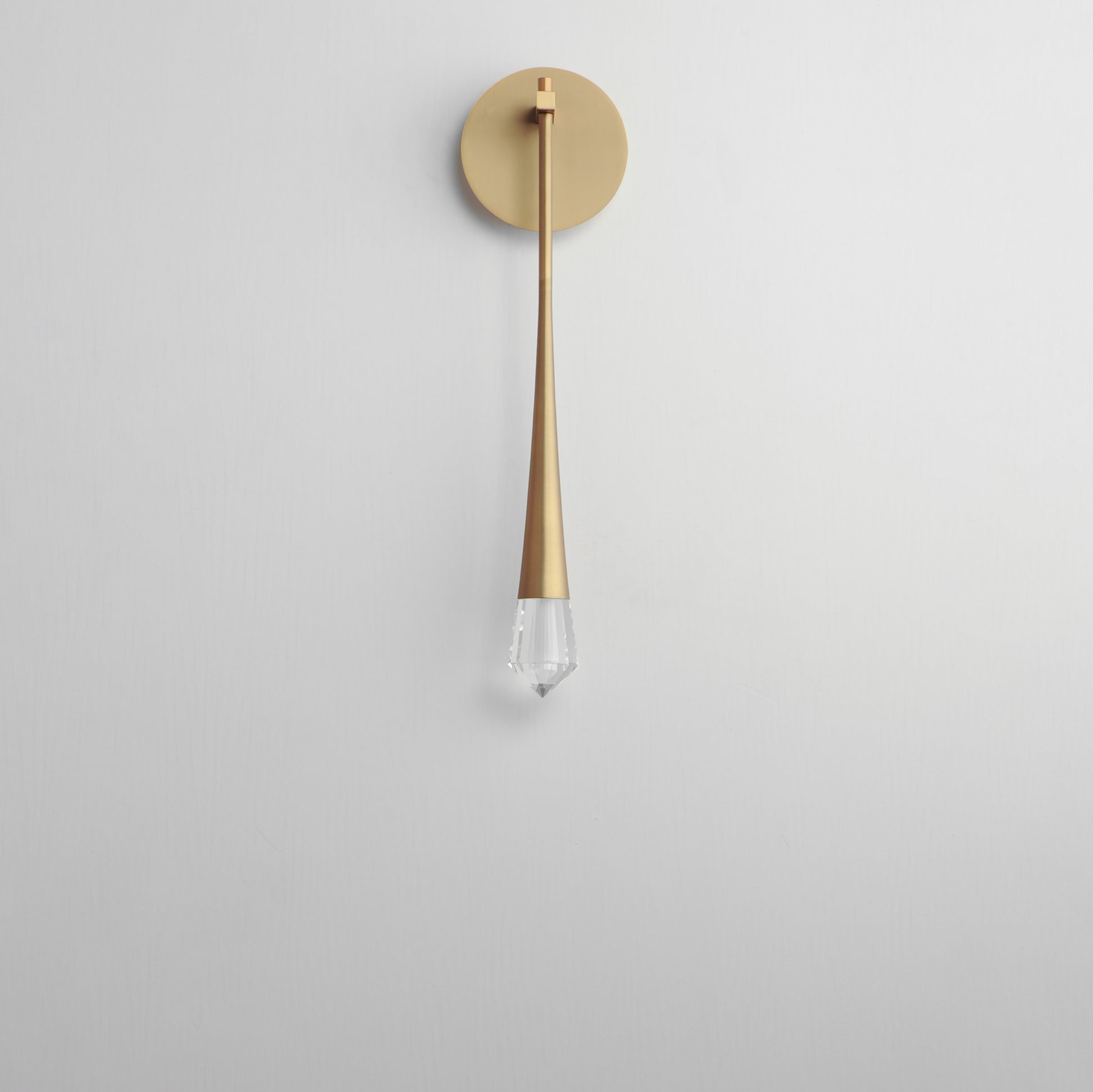 An elongated profile with piercing statement, this series of pendants feature thin black wires that support a tapered metal pendant. Recessed in this form is a high powered LED that illuminates a brilliantly faceted crystal element with etched details inside its form to capture light and enhance its beauty. Available in Gold or Matte Black, the design complements both modern and many transitional interiors. A coordinating ADA compliant wall sconce was designed with a rigid stem for public spaces and has been sealed for use in damp locations.