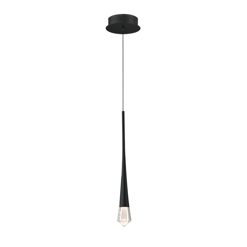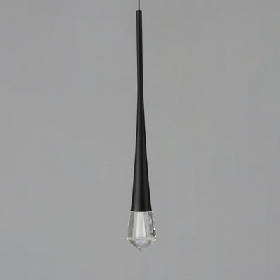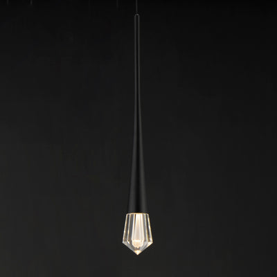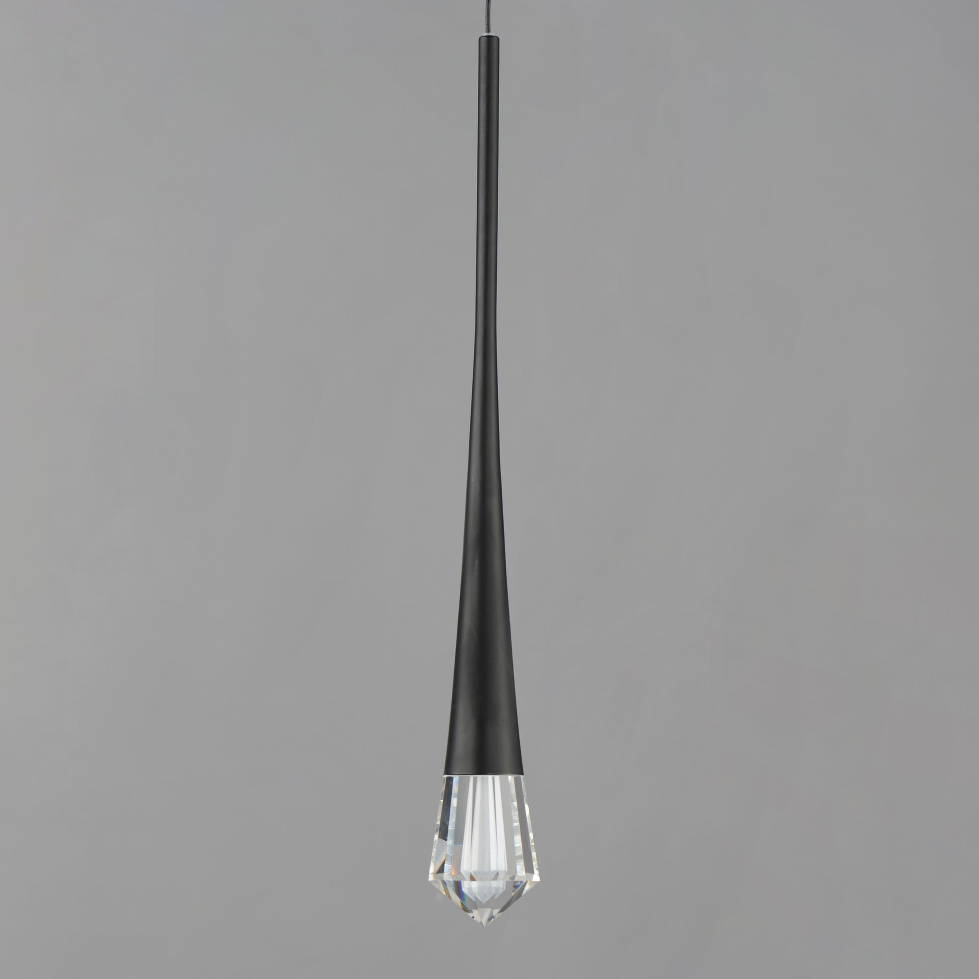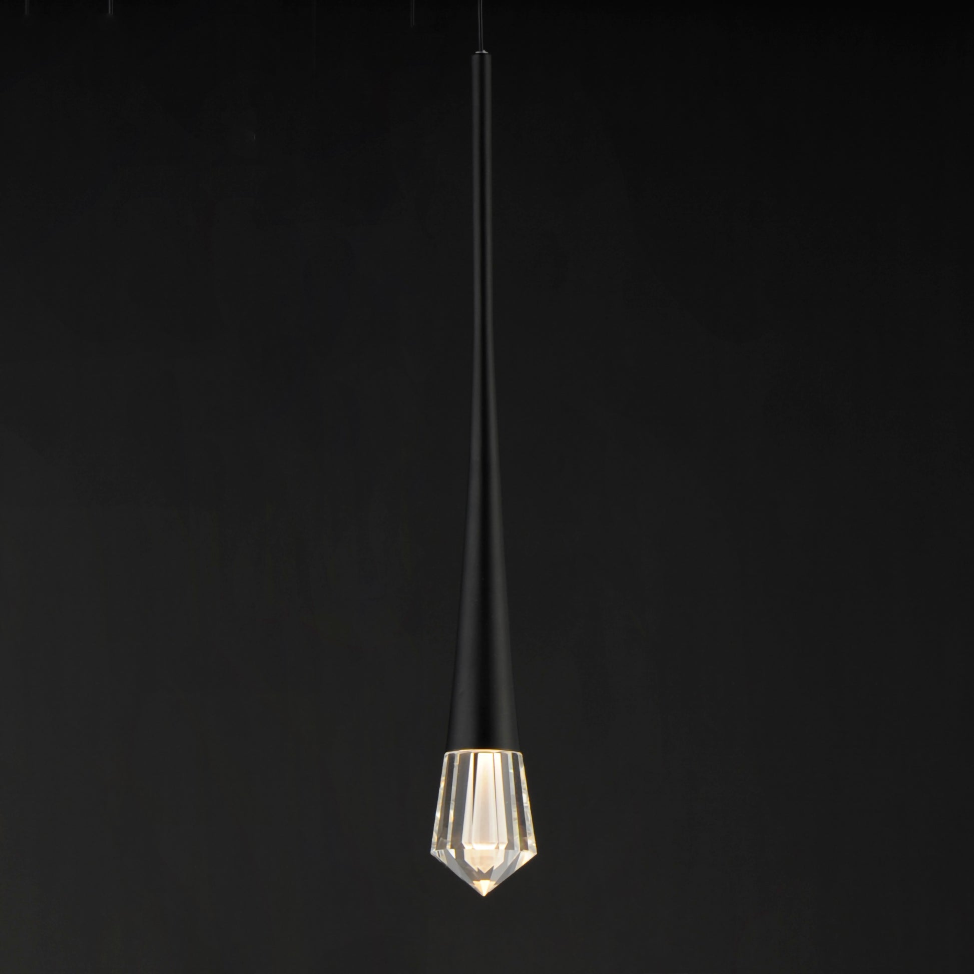 An elongated profile with piercing statement, this series of pendants feature thin black wires that support a tapered metal pendant. Recessed in this form is a high powered LED that illuminates a brilliantly faceted crystal element with etched details inside its form to capture light and enhance its beauty. Available in Gold or Matte Black, the design complements both modern and many transitional interiors. A coordinating ADA compliant wall sconce was designed with a rigid stem for public spaces and has been sealed for use in damp locations.