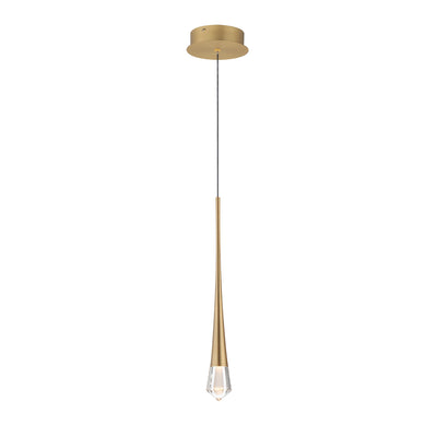 An elongated profile with piercing statement, this series of pendants feature thin black wires that support a tapered metal pendant. Recessed in this form is a high powered LED that illuminates a brilliantly faceted crystal element with etched details inside its form to capture light and enhance its beauty. Available in Gold or Matte Black, the design complements both modern and many transitional interiors. A coordinating ADA compliant wall sconce was designed with a rigid stem for public spaces and has been sealed for use in damp locations.