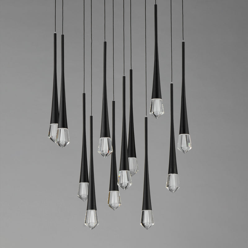 An elongated profile with piercing statement, this series of pendants feature thin black wires that support a tapered metal pendant. Recessed in this form is a high powered LED that illuminates a brilliantly faceted crystal element with etched details inside its form to capture light and enhance its beauty. Available in Gold or Matte Black, the design complements both modern and many transitional interiors. A coordinating ADA compliant wall sconce was designed with a rigid stem for public spaces and has been sealed for use in damp locations.