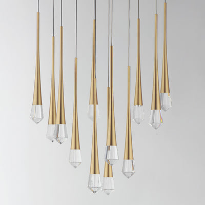 An elongated profile with piercing statement, this series of pendants feature thin black wires that support a tapered metal pendant. Recessed in this form is a high powered LED that illuminates a brilliantly faceted crystal element with etched details inside its form to capture light and enhance its beauty. Available in Gold or Matte Black, the design complements both modern and many transitional interiors. A coordinating ADA compliant wall sconce was designed with a rigid stem for public spaces and has been sealed for use in damp locations.