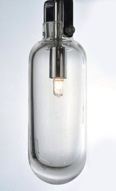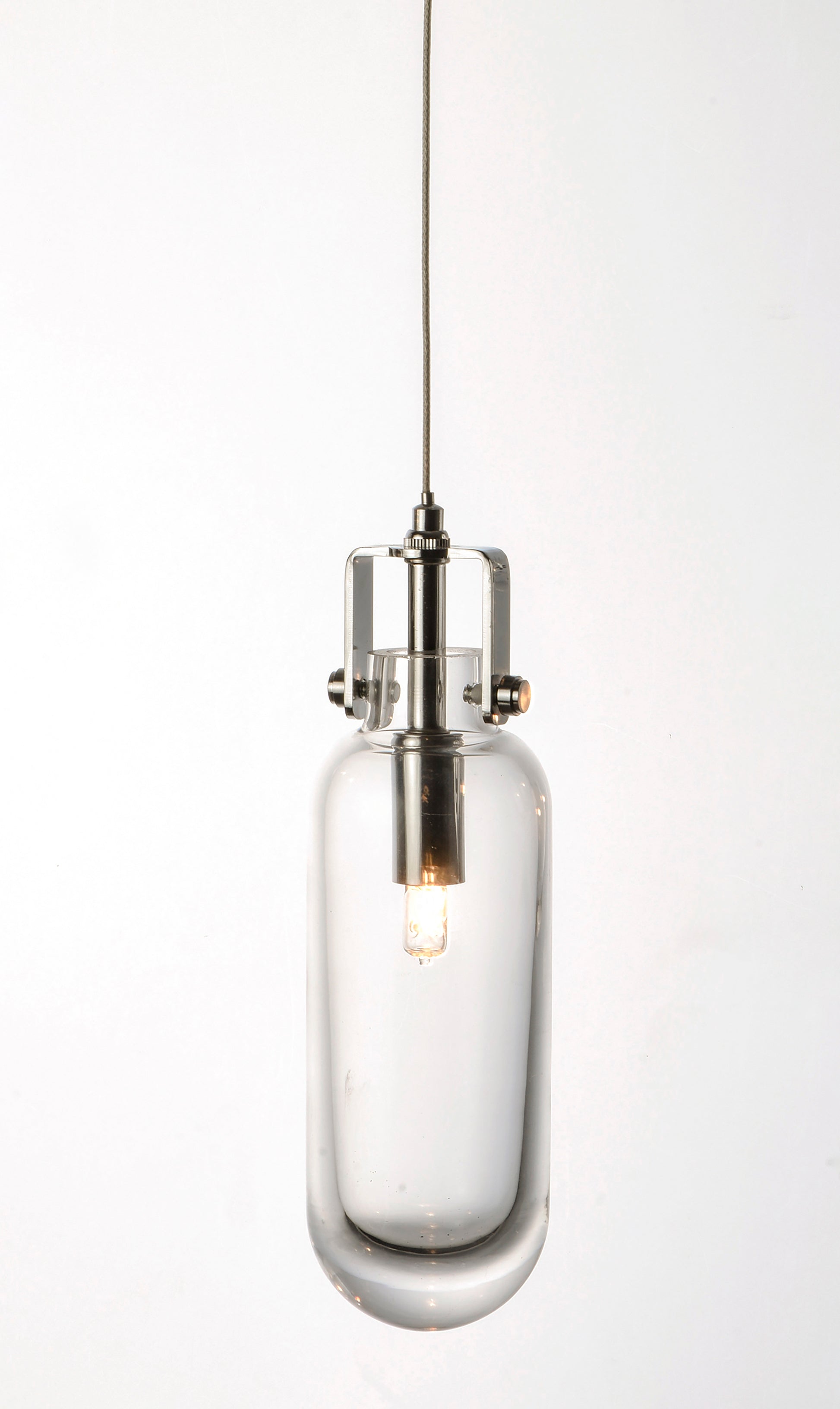 Hand blown Clear glass shades are supported from a unique criss cross design frame of Polished Chrome. The thick glass in the bottom of the shade creates an interesting optical effect when illuminated by the xenon lamps included.