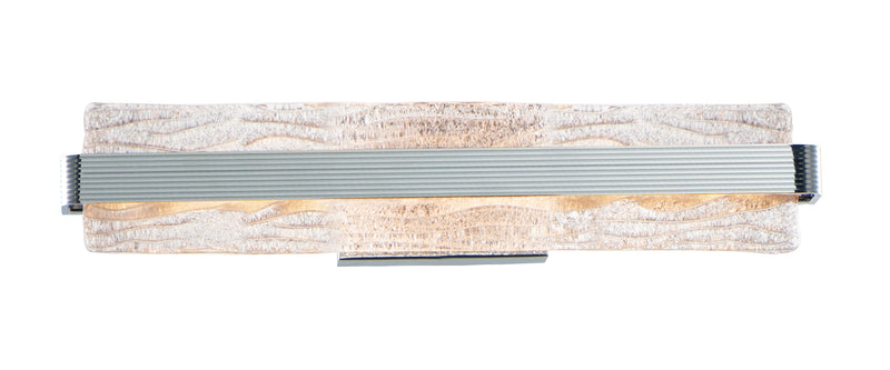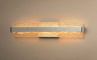 A rippled horizontal bar in Polished Chrome illuminates hand-crafted artisanal Piastra-style glass. The glass's intricate texture creates an interesting light effect on the wall. Can be mounted either vertically as a wall sconce or horizontally over a mirror.