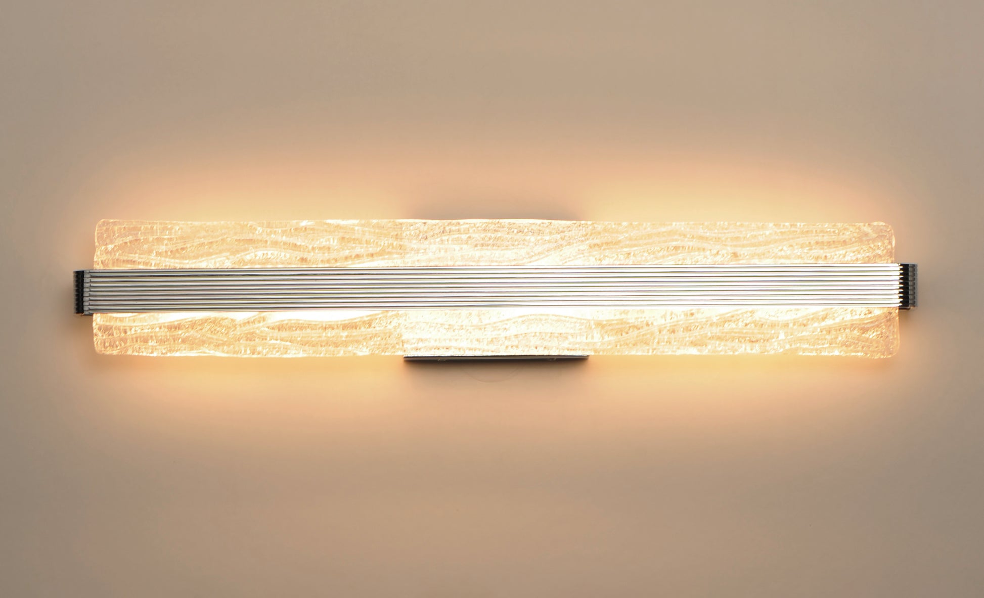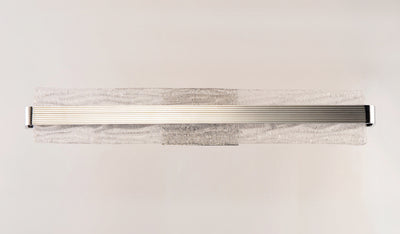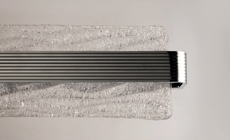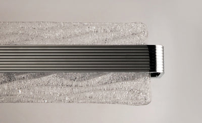 A rippled horizontal bar in Polished Chrome illuminates hand-crafted artisanal Piastra-style glass. The glass's intricate texture creates an interesting light effect on the wall. Can be mounted either vertically as a wall sconce or horizontally over a mirror.