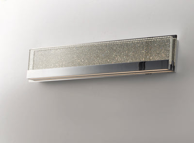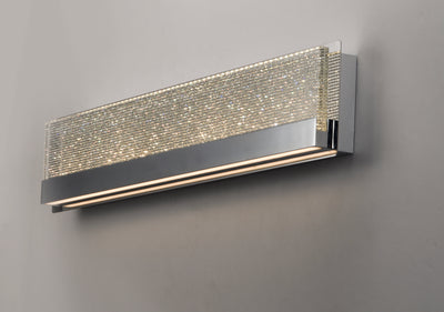 Thousands of miniature crystals are embedded into a sheet of clear acrylic which form a material we call Gemite. When illuminated by the LED mounted in the Polished Chrome frame the Gemite glistens like the stars in a galaxy. With the added downlight you get both glamour and ample lighting from this beautiful vanity collection.