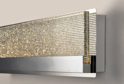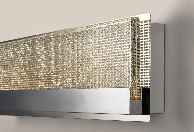 Thousands of miniature crystals are embedded into a sheet of clear acrylic which form a material we call Gemite. When illuminated by the LED mounted in the Polished Chrome frame the Gemite glistens like the stars in a galaxy. With the added downlight you get both glamour and ample lighting from this beautiful vanity collection.
