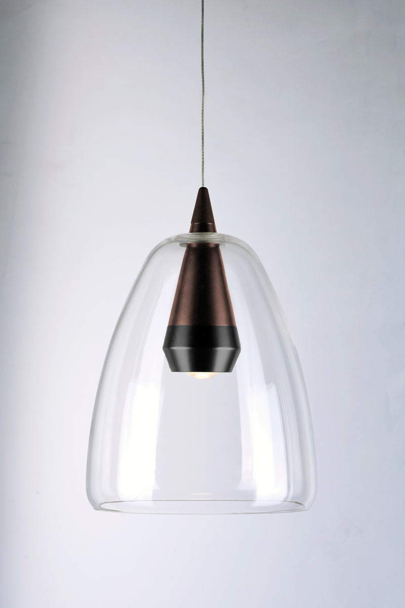 Clear glass domes are suspended from a machined aluminum font finished in your choice of two tone Silver with a Polished Chrome accent or Black with a brushed Coffee finish. Housed inside the machined font is a high power LED module which illuminates without glare.