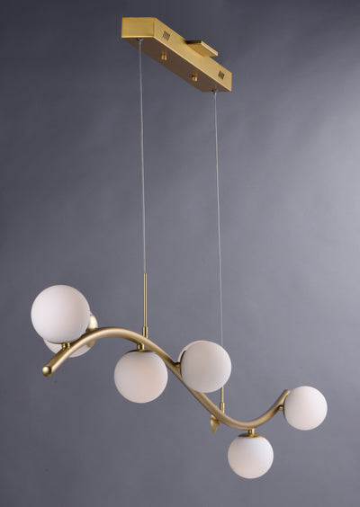 A gently curved, tapered rod finished in Metallic Gold is adorned with several Satin White glass balls and illuminated by integrated LED. The Rover collection is the interpretation of an organically formed brach with buds of white glass that is sure to add elegance to any room.