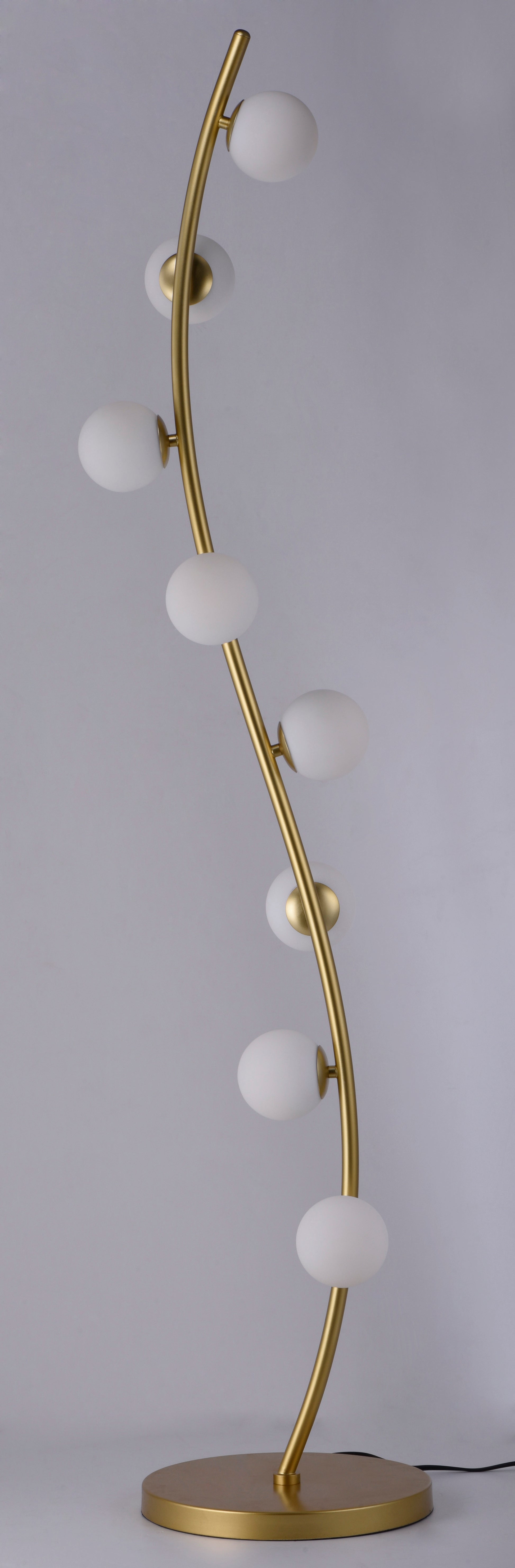 A gently curved, tapered rod finished in Metallic Gold is adorned with several Satin White glass balls and illuminated by integrated LED. The Rover collection is the interpretation of an organically formed brach with buds of white glass that is sure to add elegance to any room.