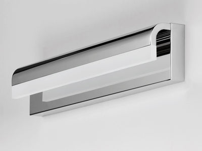 An aluminum frame of Polished Chrome or Black, cascades downward and supports a frosted acrylic diffuser which nicely diffuses the light from the LED enclosed. A perfect complement to the similar bath hardware found in many homes today.