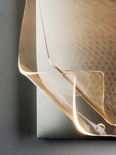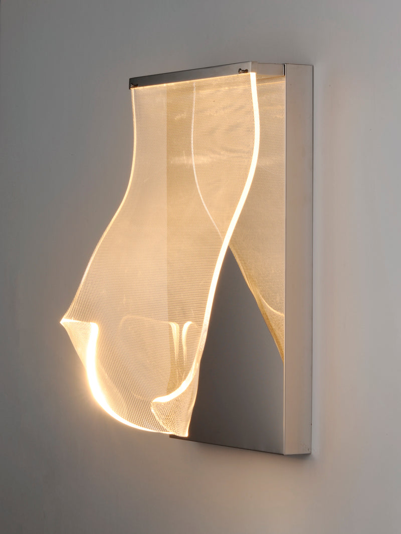 An airy arrangement of abstract forms, the Rinkle pendants feature sheets of transparent acrylic shaped by hand. The light guided acrylic captures the glow of energy efficient LEDs recessed within strips of shining stainless steel, obscuring the source of illumination. Delicately suspended by a series of thin wires, the pendants appear to be floating in an adjustable configuration of weightless light sculpture. Available in Polished Chrome, French Gold, and Brushed Gunmetal, its unique design adds a showstopping element to interior spaces.