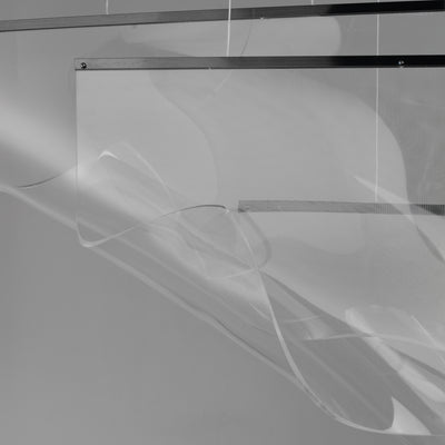 An airy arrangement of abstract forms, the Rinkle pendants feature sheets of transparent acrylic shaped by hand. The light guided acrylic captures the glow of energy efficient LEDs recessed within strips of shining stainless steel, obscuring the source of illumination. Delicately suspended by a series of thin wires, the pendants appear to be floating in an adjustable configuration of weightless light sculpture. Available in Polished Chrome, French Gold, and Brushed Gunmetal, its unique design adds a showstopping element to interior spaces.